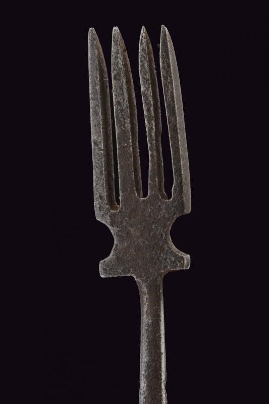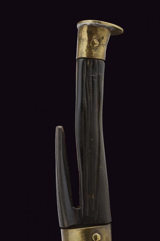 Calabria, lunghezza open 18 cm. XIX Secolo Lama a un filo con dorso decorato con intaglio a tacche. Impugnatura in corno di mucca dotata al dorso di uno scasso atto a contenere la sua forchettina d'accompagno; questa lavorata in un unico pezzo in ferro, a quattro rebbi con manico controcurvato e leggermente intagliato. Fornimenti in ottone. Modello senza molla.