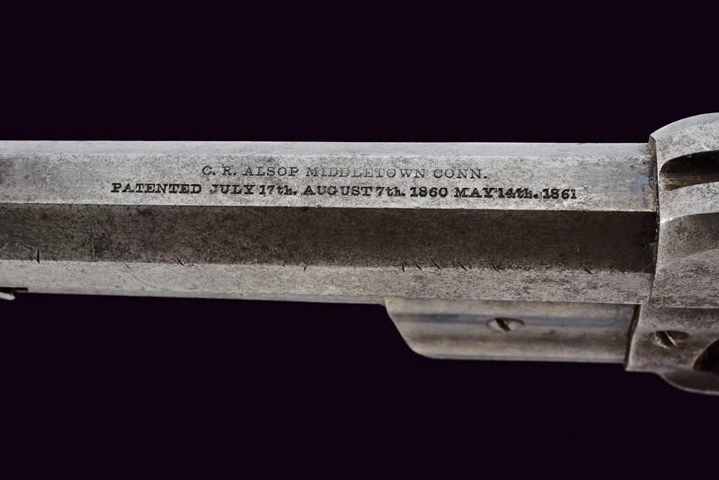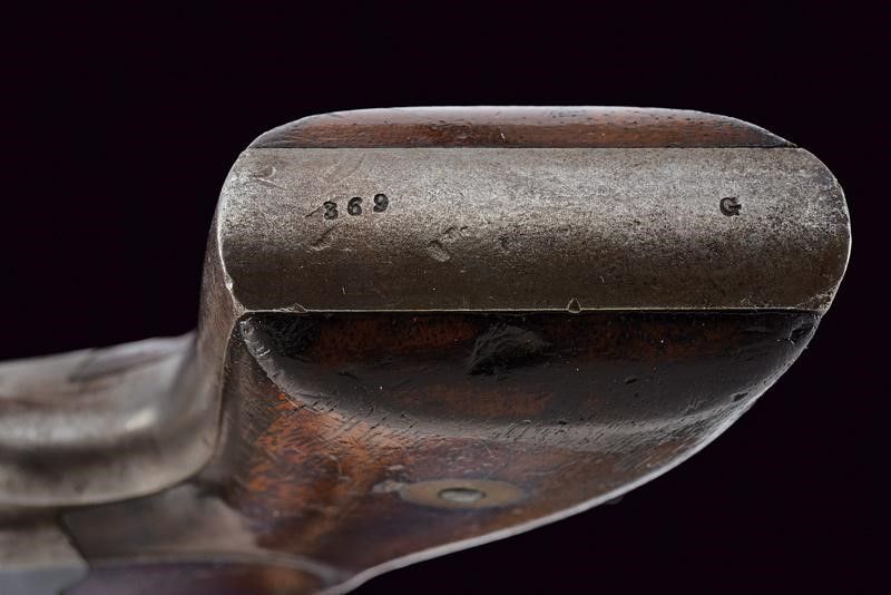 1862 - 1863 Canna ottagonale rigata da 4' (rigatura visibile, un po' di incrostazioni all'interno), con mirino in ottone, recante marcatura dorsale standard in due righe con brevetti fino al 1861, cal. 36. Tamburo a cinque colpi del tipo sgusciato con brevetti sino al 1861. Lievi tracce di brunitura antica. Meccanica funzionate, il blocco del tamburo con il cane tirato necessita di revisione. Castello con resti del brevetto del 1859, grilletto a sprone. Alcune intaccature. Matricola '3xx' sull'impugnatura, e il punzone 'G'. Guancette in noce. Qualche elemento con lievi tracce di finitura.