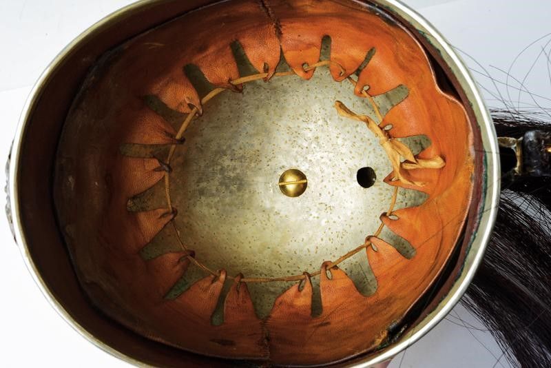 Regno d'Italia, altezza 32 cm. 1940 circa Coppo in alpacca con fornimenti dorati, cimiero in ottone con bella doratura, ceffo a testa di leone con coda in crine nero, oliva con scudo sabaudo coronato, raggiera sormontata da aquila con corona argentata, caricata sul petto dal monogramma VE III (Vittorio Emanuele III 1900-1946). Tipico soggolo a squame con orecchioni tondi con stella, coccarda tricolore in cotone e pennacchio originale rosso-bianco. Interno con visiere rivestite di marocchino rosso, alluda in pelle chiara lavorata a spicchi.