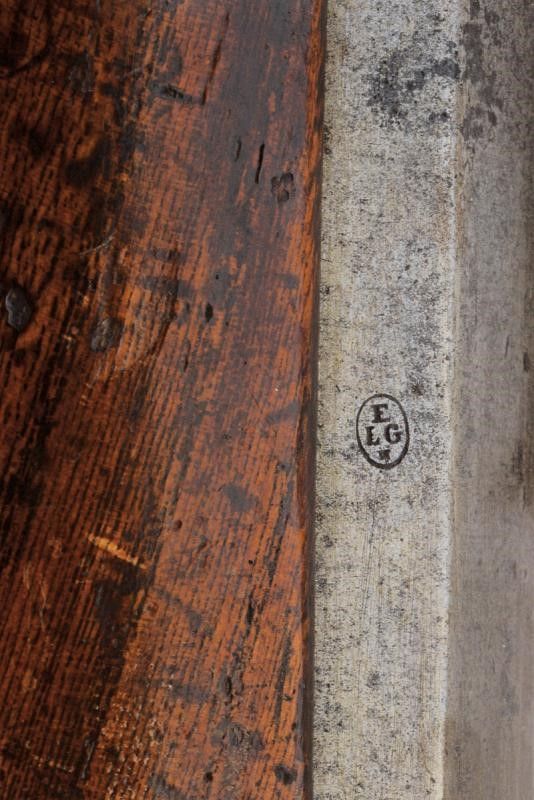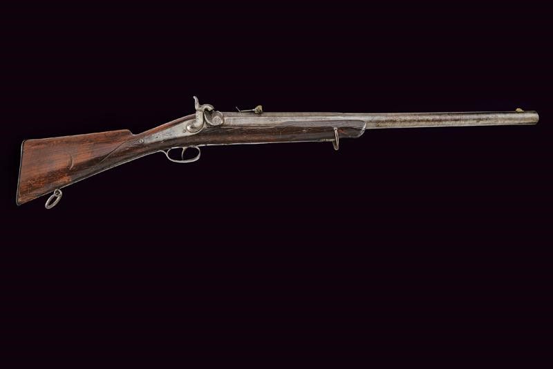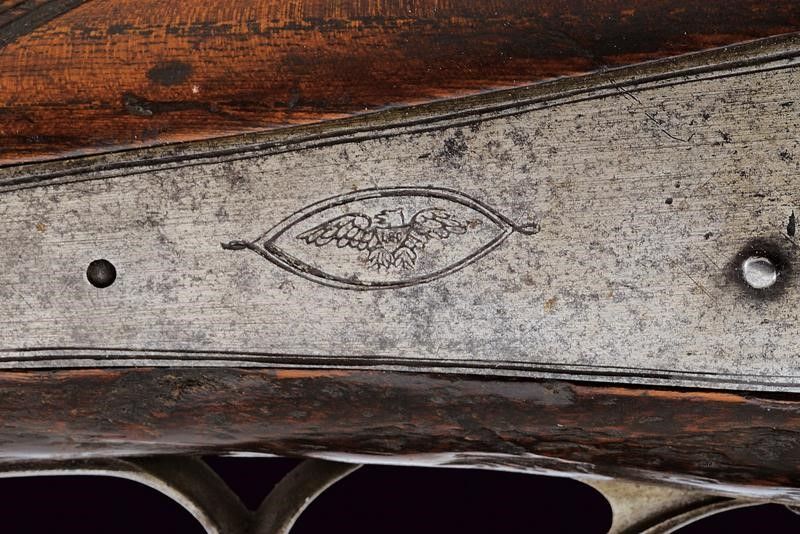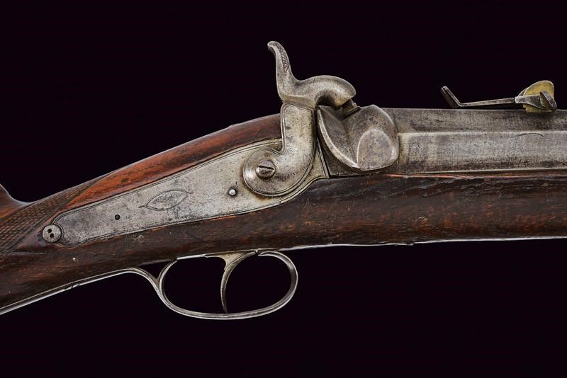 Europa, lunghezza 127 cm. Pesante canna a due ordini a torcione, ottagonale e tonda, rigata, dotata di mirino in ottone e con alzo regolabile, cal. 23,4 mm(!) La culatta con ampia base per il pistone sul fianco destro, munito di parascintille. Batteria a molla indietro recante emblema ad aquila caricata con scudo recante tre lettere non chiaramente leggibili (forse LSC). Meccanica funzionante. Mezza cassa in legno con alcuni fori di tarlo e un tassello mancante. Bacchetta mancante. Fornimenti in ferro.