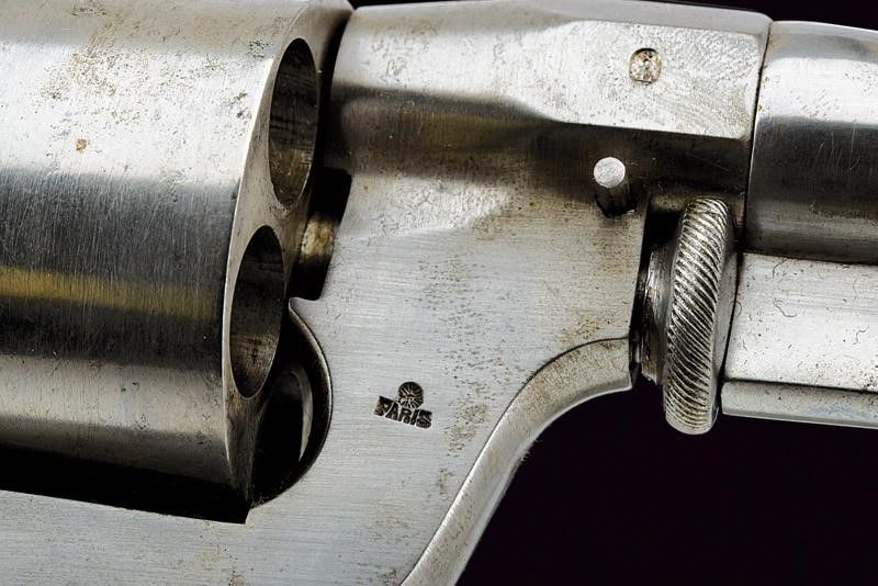 Canna tonda, rigata, dotata di mirino, cal. 11 mm. Tamburo liscio a sei colpi, castello liscio marcato 'PERRIN & C.ie B.te' e 'Paris'; guancette in legno.