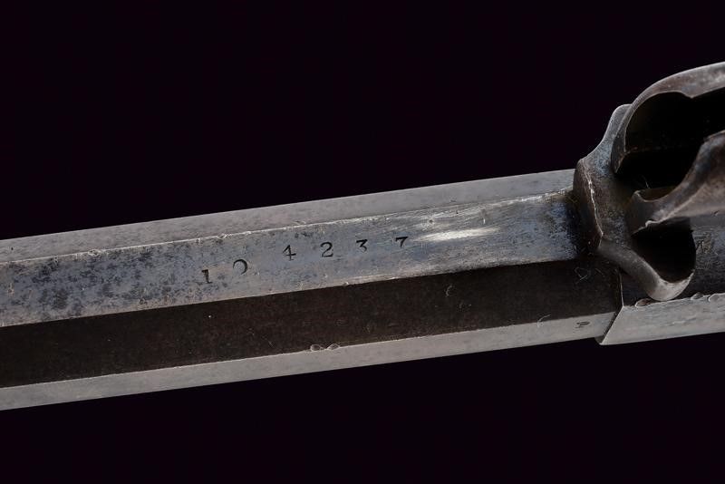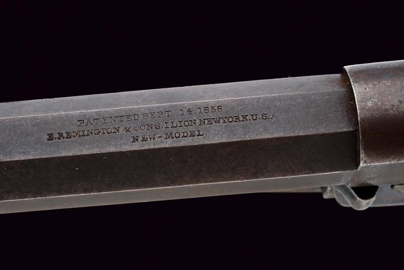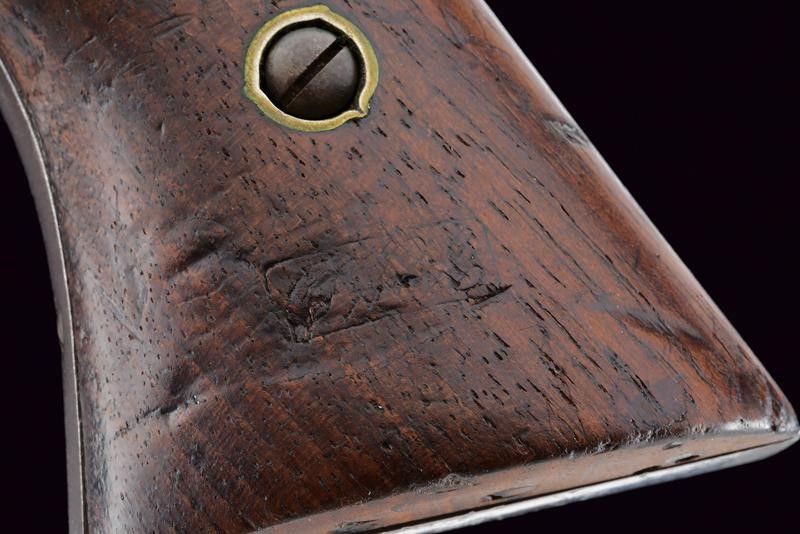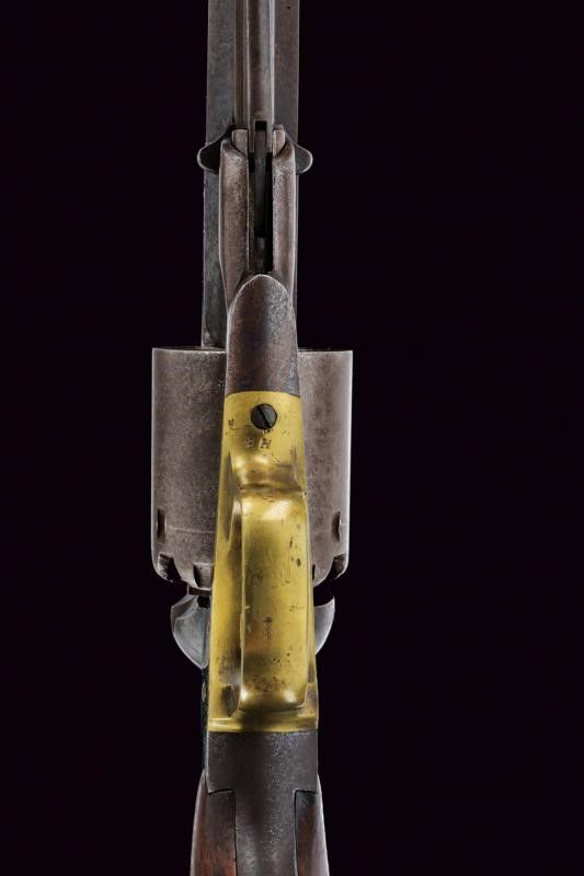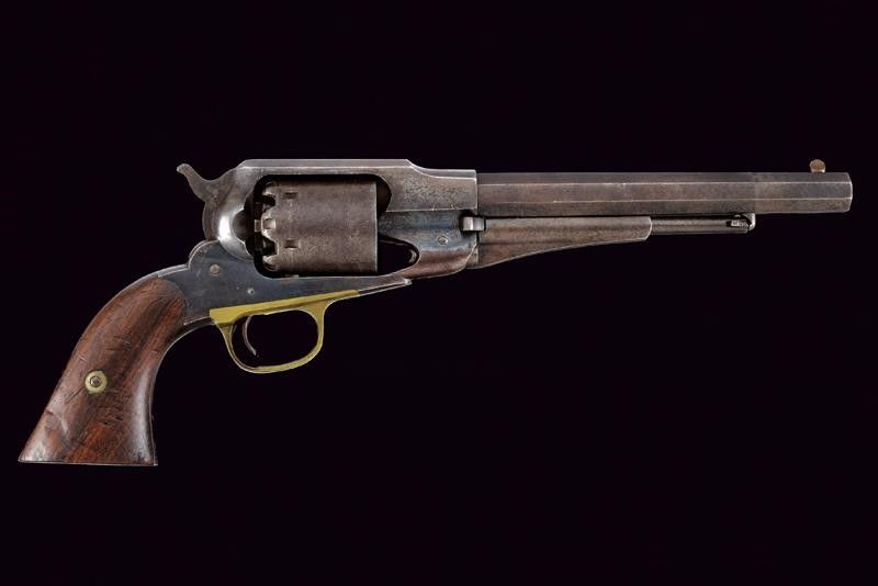 USA, lunghezza 35,5 cm. 1863 - 1875 Canna ottagonale rigata da 8' (anima in buono stato, rigatura visibile), dotata di mirino, recante al dorso la marcatura in tre righe standard con dicitura 'NEW MODEL', con punzoni 'D' e 'P', cal. 44. Tamburo a sei colpi punzonato 'C' e 'H'. Meccanica ben funzionante. Ponticello in ottone. Qualche segno d'uso e del tempo. Tracce di brunitura antica color blu. Matr. '104xxx' su canna e impugnatura. Guancette in legno, quella sinistra con resti di timbro d'ispezione militare.
