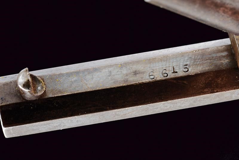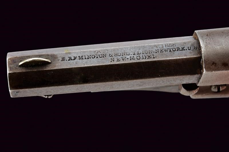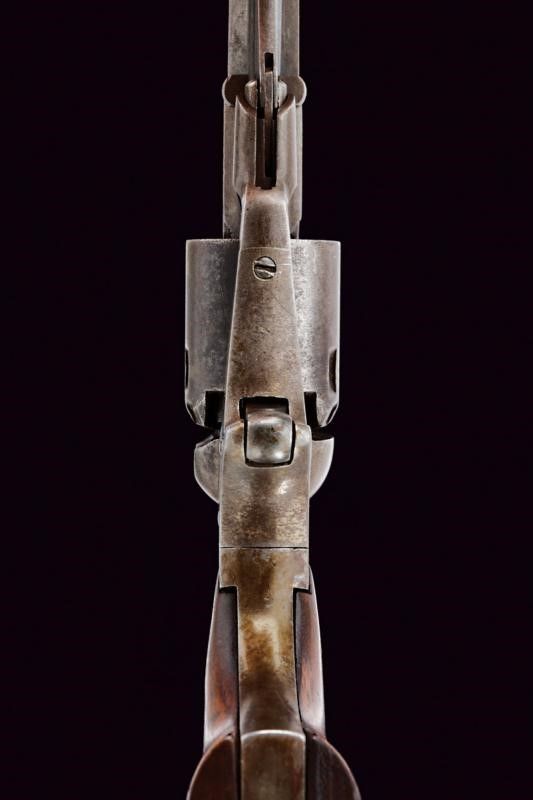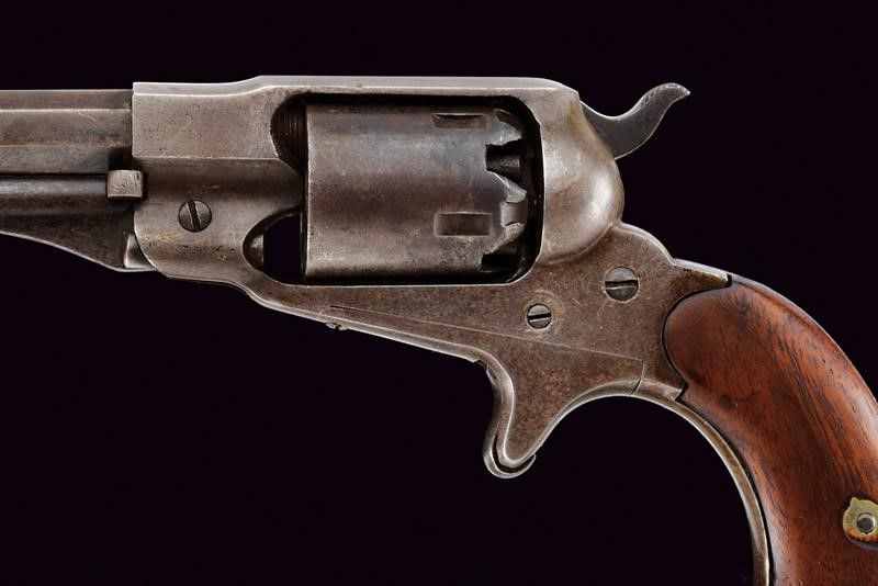 1865 - 1873 Canna ottagonale rigata da 3', dotata di mirino a semicerchio, al dorso marcatura in tre righe con brevetto solo del 1858 e 'NEW-MODEL', cal. 31. Tamburo a cinque colpi. Meccanica da rivedere (cane e grilletto funzionanti, il tamburo non ruota). Castello con grilletto a sprone. Guancette lisce in noce (vite al contrario). Matr. '66xx' su canna e impugnatura. Resti di brunitura antica color blu prevalentemente su canna e calcatoio.