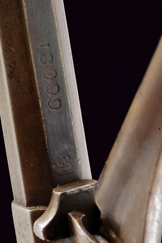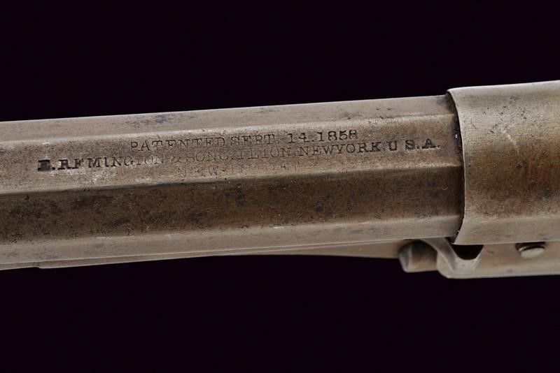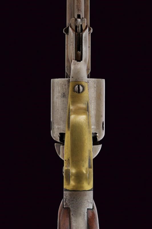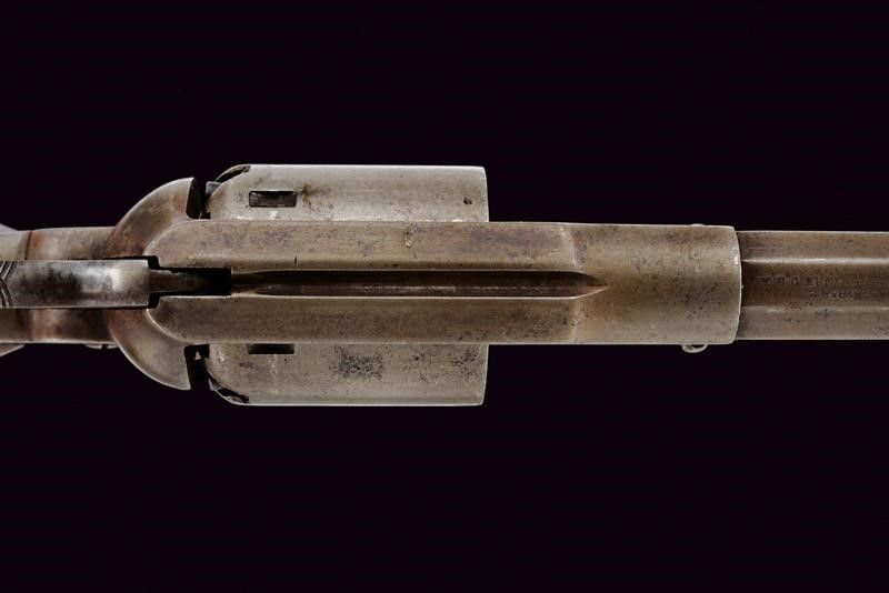 1865 - 1873 Canna ottagonale rigata da 4-1/2' (anima con segni d'uso, rigatura visibile, lieve svasatura in volata), dotata di mirino a semicerchio, recante al dorso la marcatura in tre righe, solo con brevetto del 1858, e dicitura 'NEW MODEL' (lievemente svanita), cal. 36. Tamburo a cinque colpi. Meccanica ben funzionante. Ponticello in ottone. Qualche segno d'uso e del tempo, lievissime intaccature, forse qualche traccia di finitura antica. Matr. '18xxx' (o 13xxx, non chiaramente leggibile) su canna e impugnatura. Guancette in noce.