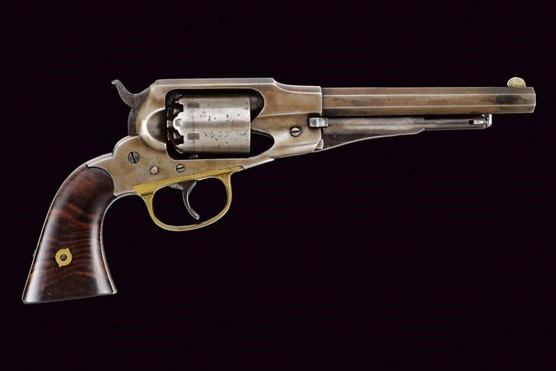 USA, lunghezza 30 cm. 1863 - 1873 Canna ottagonale rigata da 6-1/2' (anima con lievi segni d'uso, rigatura visibile), dotata di mirino a semicerchio, recante al dorso la marcatura del secondo tipo in tre righe con 'NEW MODEL', cal. 36. Tamburo a sei colpi. Meccanica funzionante. Ponticello in ottone. Qualche segno d'uso e del tempo soprattutto al tamburo e al cane. Matr. '47xx' su canna (non chiaramente visibile, ma probabilmente coeva) e impugnatura. Qualche traccia di finitura (antica?). Guancette in noce.