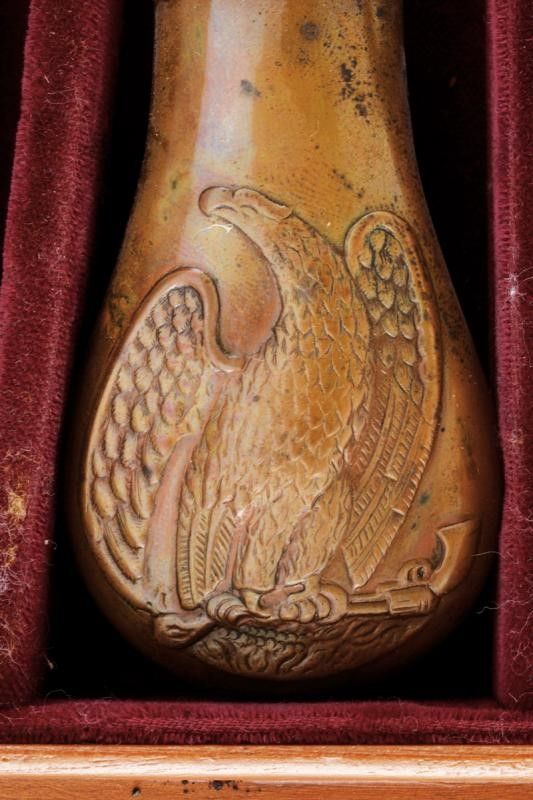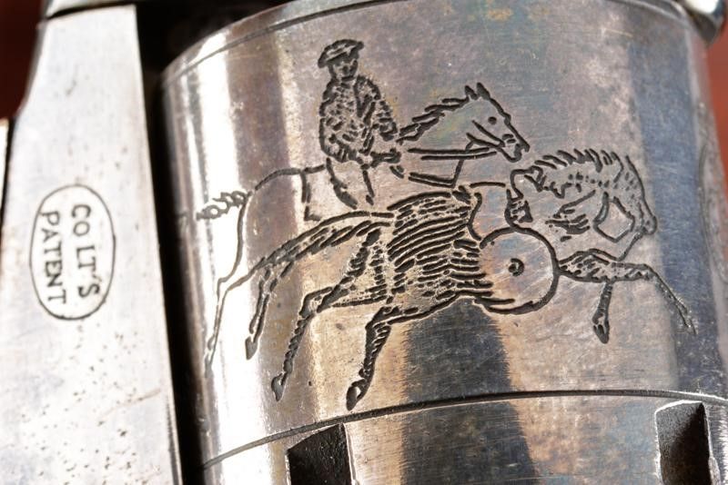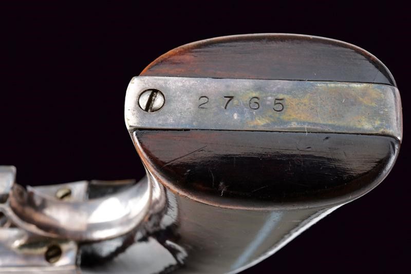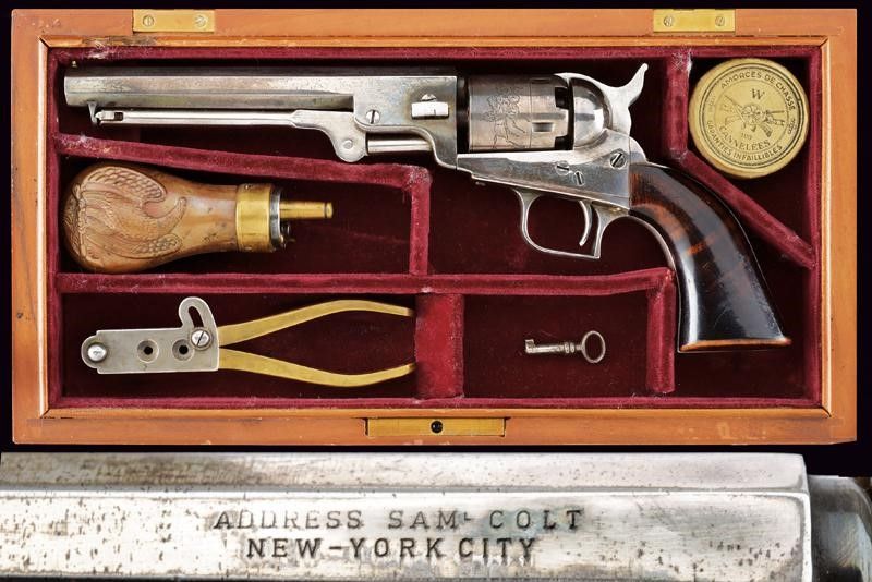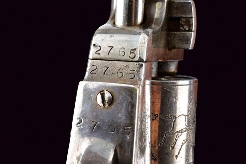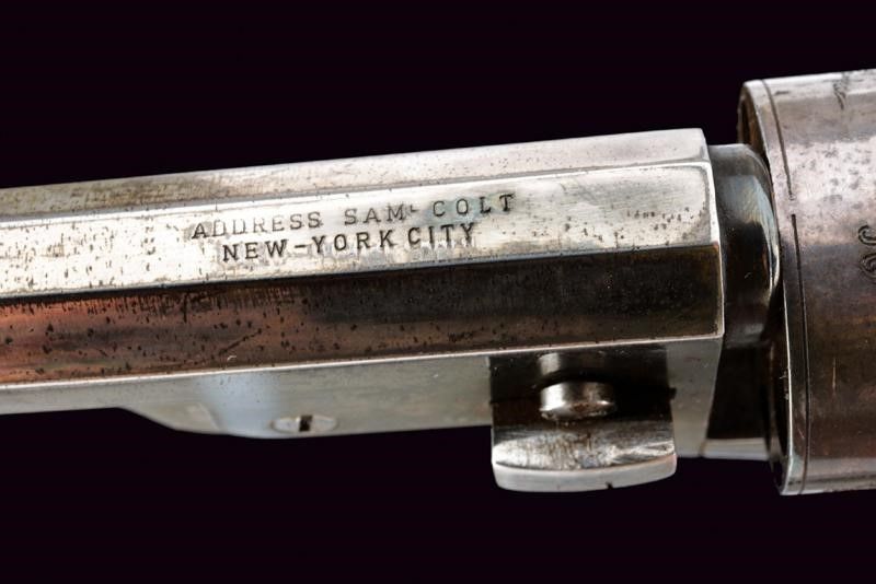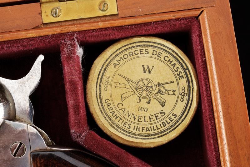 Belgio, lunghezza 26,5 cm. Seconda metà del XIX Secolo Canna ottagonale rigata con mirino in ottone, con marcatura (spuria) 'ADDRESS SAM.L COLT / NEW-YORK CITY', cal. 31. Tamburo liscio a cinque colpi con incisioni e 'PATENT'. Bande dell'impugnatura in ottone. Resti di bella finitura argentata. Ponticello con 'CAL 31'. In una cassetta con fiaschetta in ottone, fondipalle per cal. 31 e una scatolina in cartone per capsule. Completa di chiave. Revolver di tipica produzione spuria probabilmente belga. Ben realizzato.