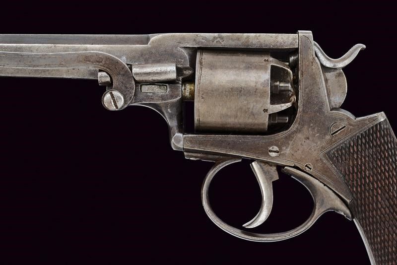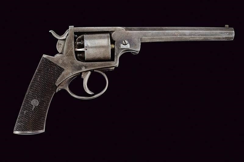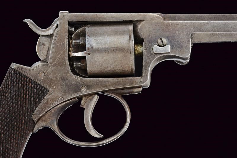 Inghilterra, lunghezza 26,5 cm. Canna ottagonale rigata, dotata di mirino (anima pulita, rigatura visibile), cal. 34. Tamburo a cinque colpi con punzoni del banco di Birmingham. Meccanica funzionante ma lo scorrimento delle parti risulta molto difficile. Castello in ferro con delineature. Impugnatura in legno zigrinato. Alcuni punti con lievi tracce di vecchia finitura.