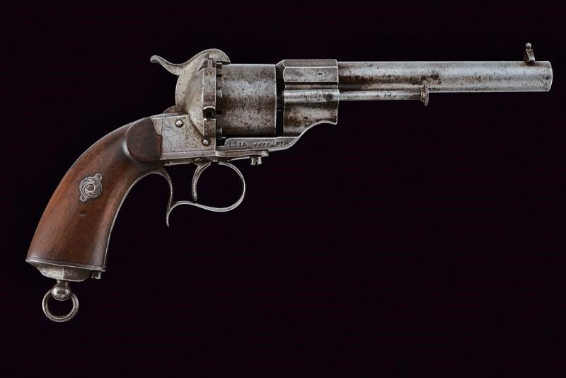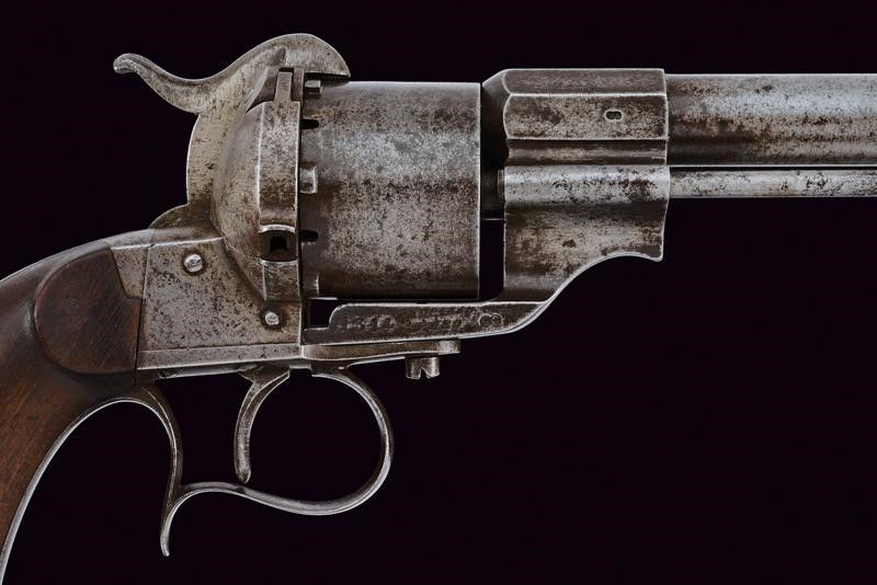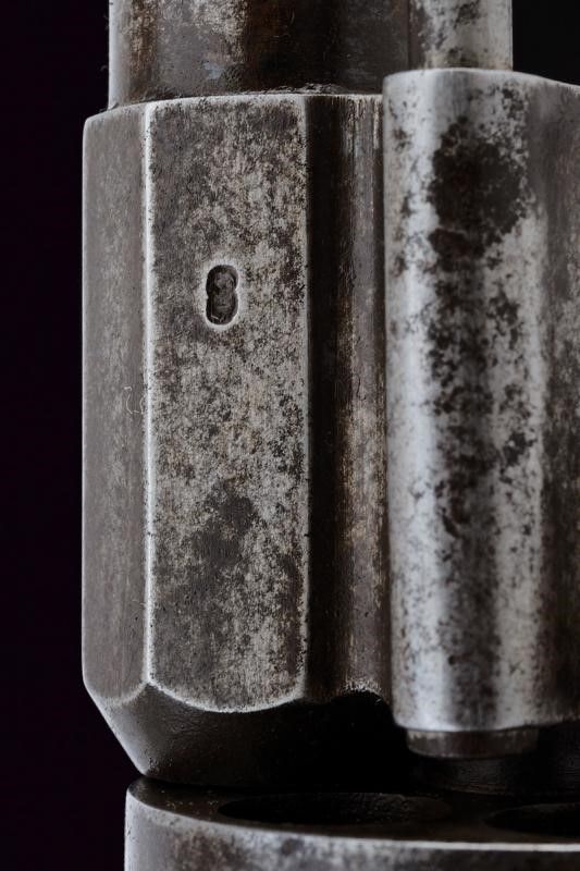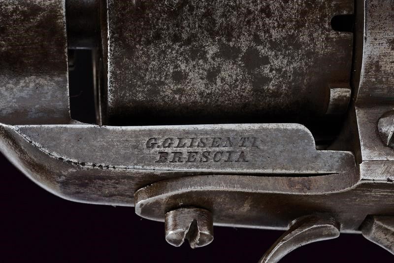 Regno d'Italia, lunghezza 30 cm. Canna cilindrica rigata (anima con leggero pitting, rigature ben visibili), dotata di mirino, cal. 11 mm. Tamburo liscio a sei colpi. Castello liscio con marcature 'G. GLISENTI BRESCIA', 'ACCIAJO FUSO' e con punzone 'GG'. Sportellino di caricamento ed estrattore. Guancette in legno. Coccia faccettata con anello porta correggiolo. Matr. '13xx'. Meccanica funzionante.