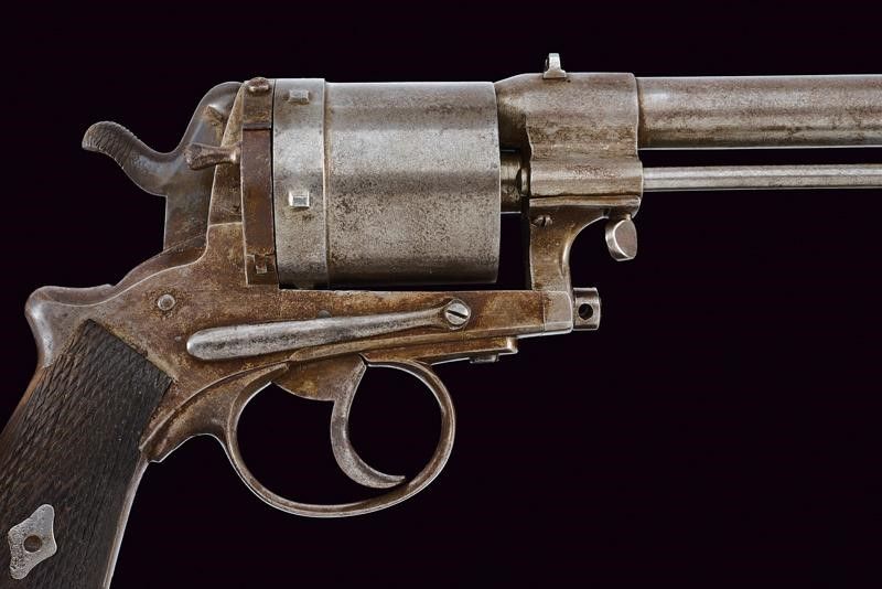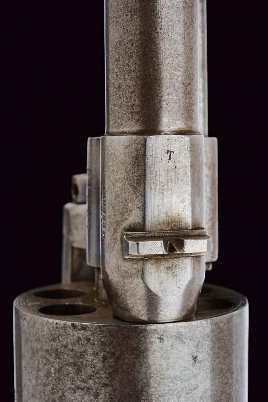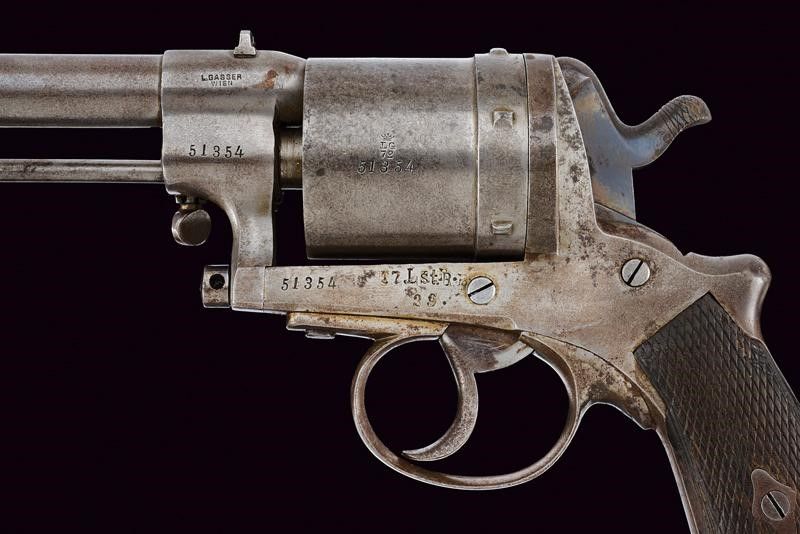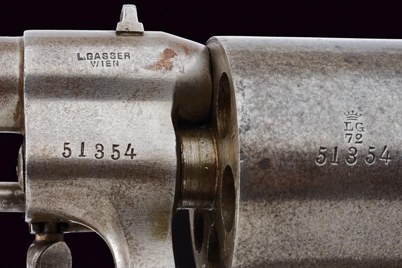 Austria, lunghezza 31,5 cm. Canna cilindrica rigata (anima pulita, rigatura visibile), dotata di mirino e tacca di mira, con punzone 'T' alla base e marcatura 'L.GASSER / WIEN', cal. 11 mm. Tamburo a sei colpi con punzone 'LG 72' coronato (per l'anno?). Meccanica funzionante. Castello con marcatura non chiaramente leggibile 'T7.Lst.B. / 29' (probabilmente numeri di reparto). Cane con tracce di brunitura color blu. Impugnatura con guancette zigrinate in legno. Anello porta correggiolo.