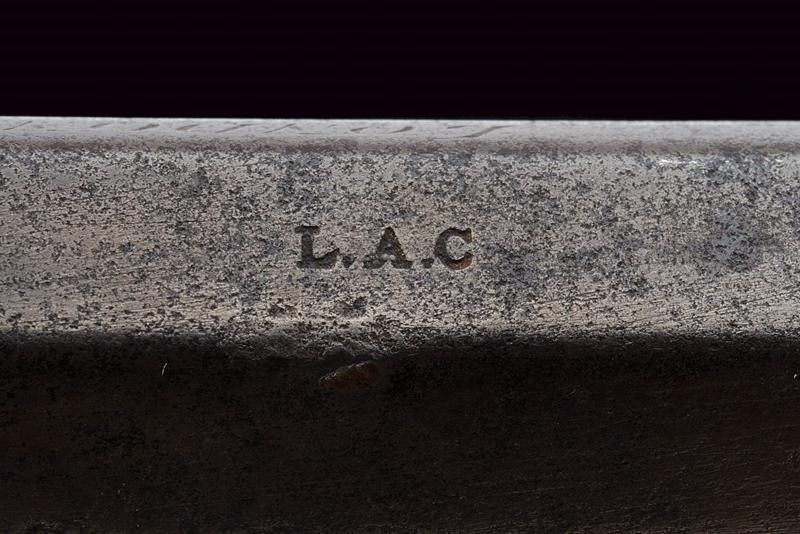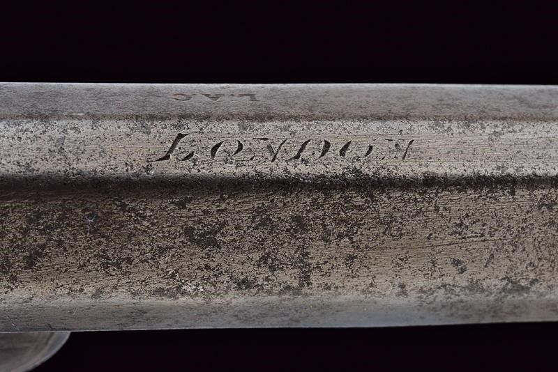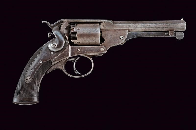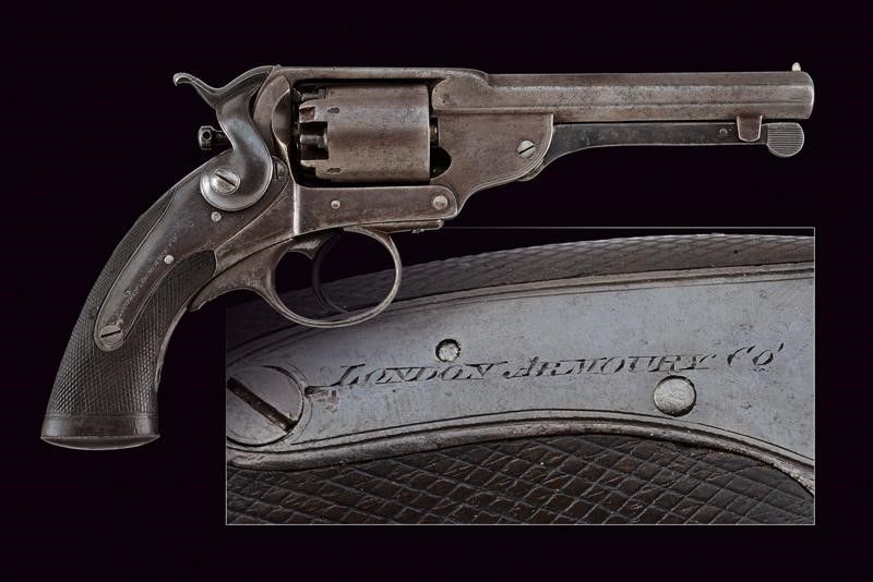 Londra, lunghezza 29,5 cm. 1860-70 Canna faccettata, rigata (un po' di pitting all'interno, rigatura visibile), con mirino a cuspide in metallo bianco, recante al dorso resti di marcatura 'LONDON'; cal. 36. Tamburo a cinque colpi con punzoni del banco di prova di Londra. Meccanica funzionante in singola azione. Castello con resti di dicitura 'KERR'S PATENT' e tracce di numerazione (forse 203?), timbro 'LONDON' e resti di incisioni. Batteria a molla indietro con marcatura 'LONDON ARMOURY CO.' Intaccature. Impugnatura zigrinata in legno.