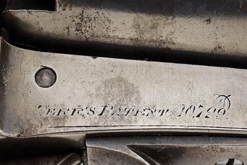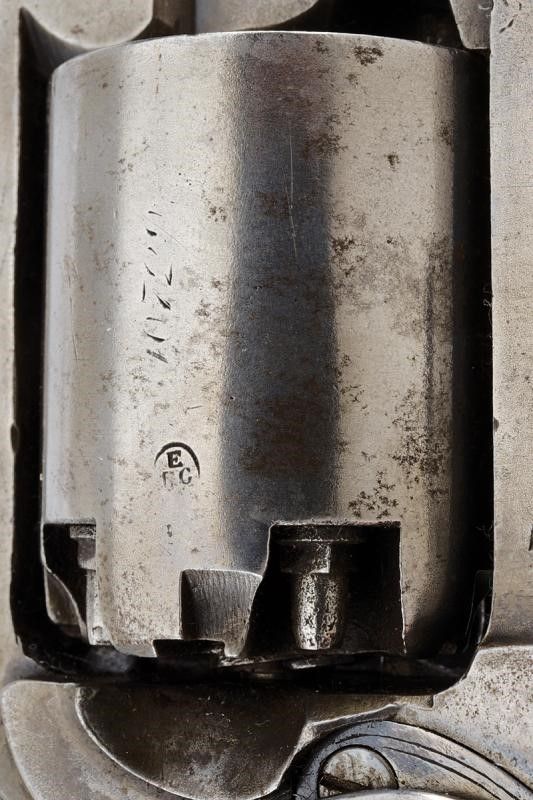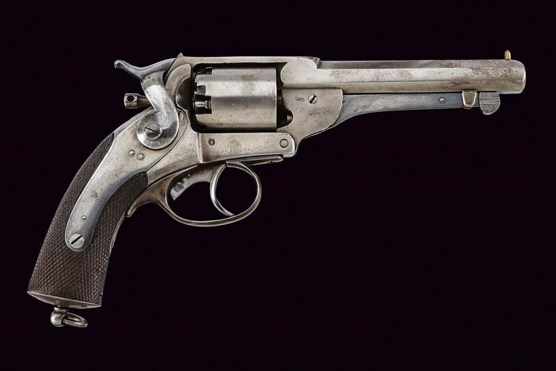 Belgio, lunghezza 28 cm. 1860-70 Canna faccettata, rigata (anima pulita, rigatura visibile), con mirino a cuspide in ottone, cal. 44. Tamburo a cinque colpi con punzone 'AF' coronato, timbro del banco di prova di Liegi, resti di matricola coeva al castello. Meccanica funzionante in singola azione. Castello con resti di marcatura del brevetto Kerr e matr. '107xx'. Batteria senza marcature. Impugnatura in legno zigrinato. Anello porta correggiolo. Lievi tracce di finitura in alcuni punti.