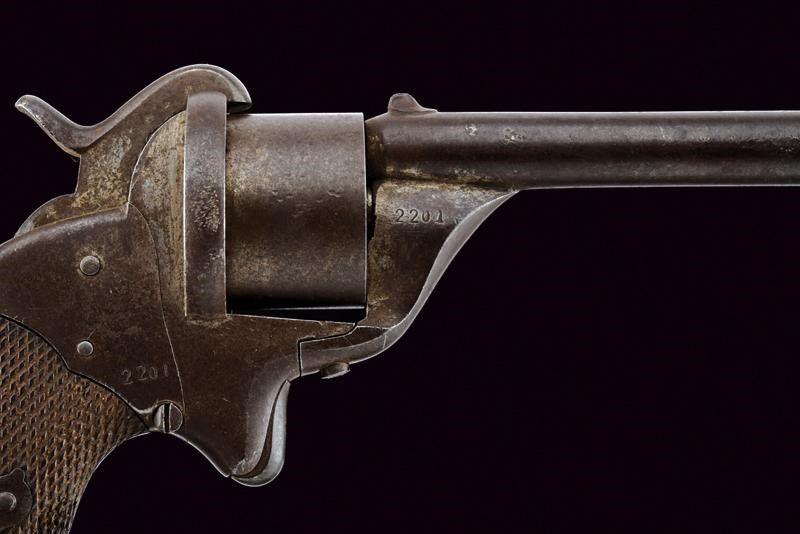Stato Pontificio, lunghezza 20.5 cm. Canna tonda rigata, munita di alzo e mirino, cal. 9 mm. Tamburo liscio a sei colpi con numero di matricola '22xx'. Castello in ferro con stesso numero di matricola, dotato di sportellino di caricamento sul fianco sinistro. Impugnatura con guancette in legno zigrinato e anello di sospensione.