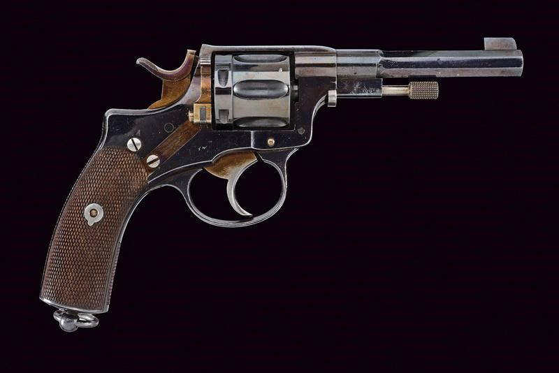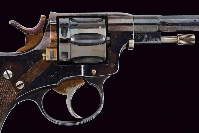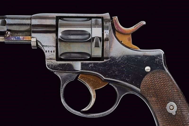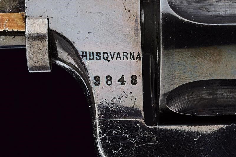 Svezia, lunghezza 23,4 cm. Canna ottagonale rigata (anima pulita, rigatura visibile) con base tonda, cal. 7,5 mm. Tamburo sgusciato a sei colpi. Meccanica ben funzionante. Castello con marcatura 'HUSQVARNA' e punzone a corona. Guancette in legno zigrinato. Anello porta correggiolo.
