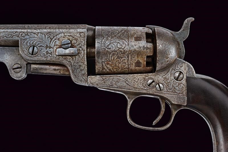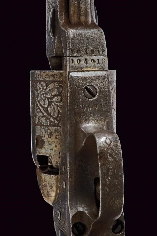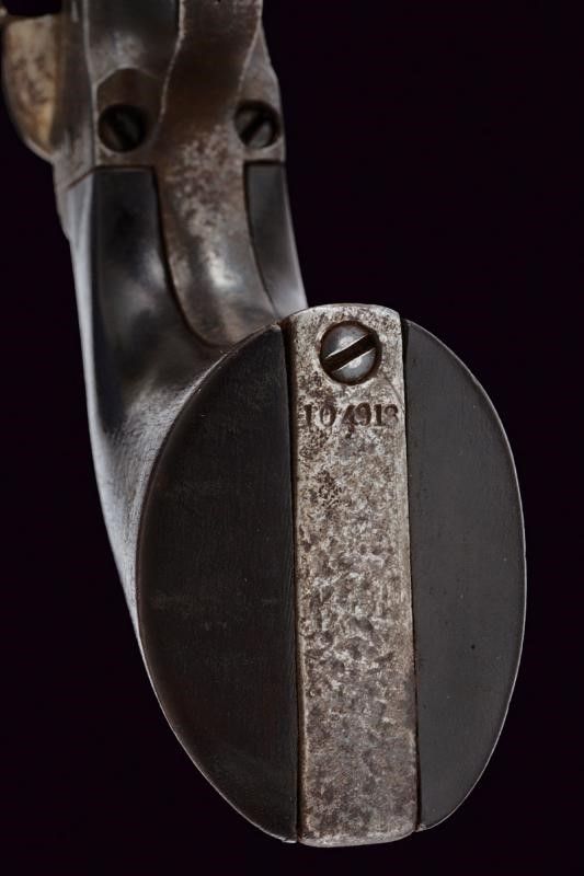 Belgio, lunghezza 32,5 cm. Seconda metà del XIX Secolo Canna ottagonale rigata, dotata di mirino in ottone, marcata al dorso 'CAP. SYSTEM MANUFACTURED BY C.CLEMENT', cal. 38 in volata. Sul fianco due punzoni coronati (spuri?). Tamburo a sei colpi con resti di punzoni en suite. Castello, canna e tamburo recanti incisioni a fiorami. Meccanica funzionante ma da rivedere. Intaccature. Impugnatura liscia in legno.