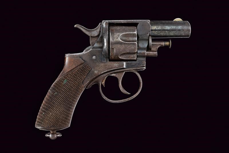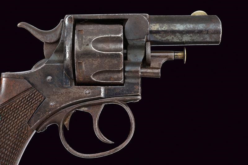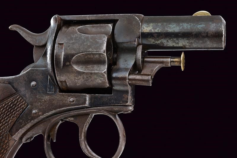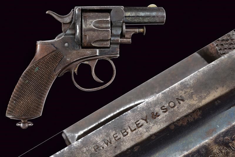 Inghilterra, lunghezza 21.5 cm. Canna rigata, tonda con bindella, mirino in argento, cal. 450. Tamburo scanalato a sei colpi con punzoni del banco di prova. Castello marcato 'W&S', 'WEBLY'S' e con marchi. La cornice superiore 'P. WEBLEY & SON' e 'LONDON & BIRMINGHAM'. Brunitura al 80 %. Calcio in legno zigrinato. Anello di sospensione. Fabbricato da Webley per Weeks & Son.