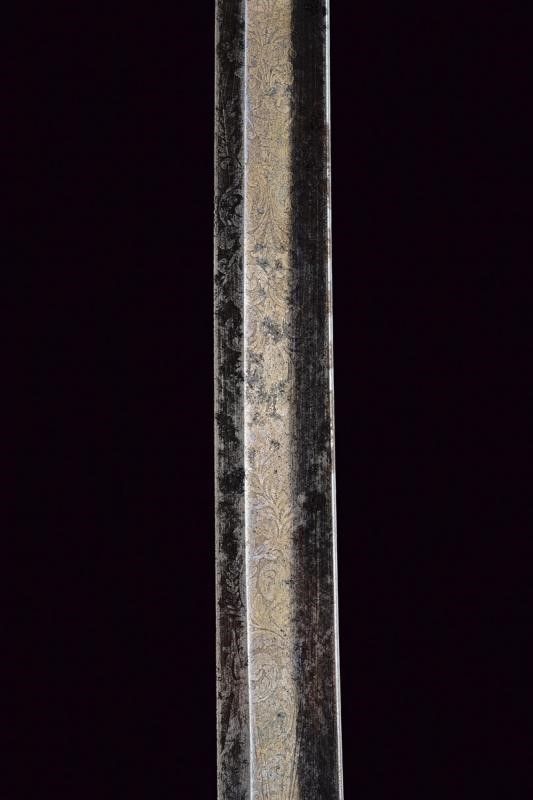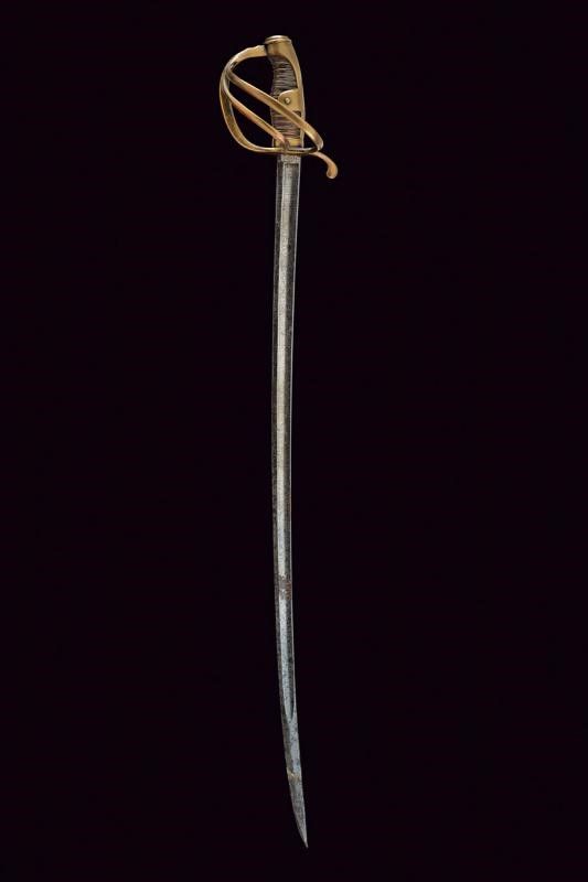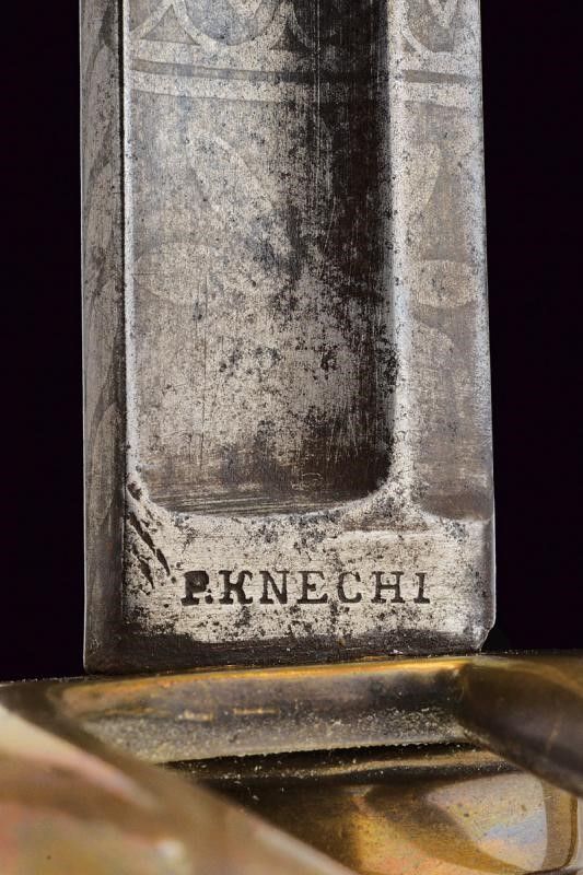 Solingen, lunghezza 93,5 cm. Lama curva a un filo e breve controfilo, sgusciata per buona parte della lunghezza, recante al forte resti di incisioni a trofei e fiorami, marcata al tallone 'P. KNECHT / SOLINGEN'. Fornimento in ottone a tre rami di guardia. Impugnatura con cappetta lunga. Rivestimento in pelle con resti di trecciola in ottone. Priva di fodero.