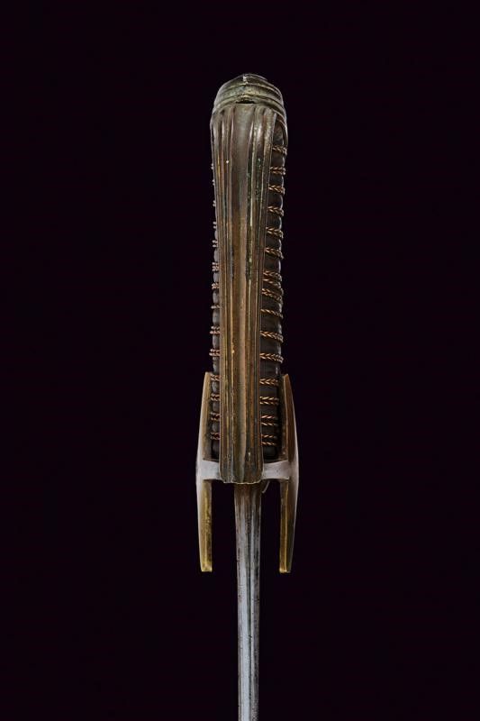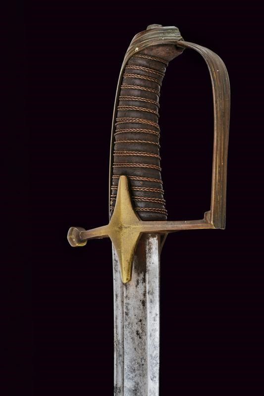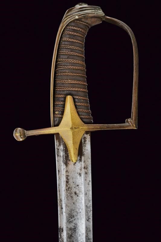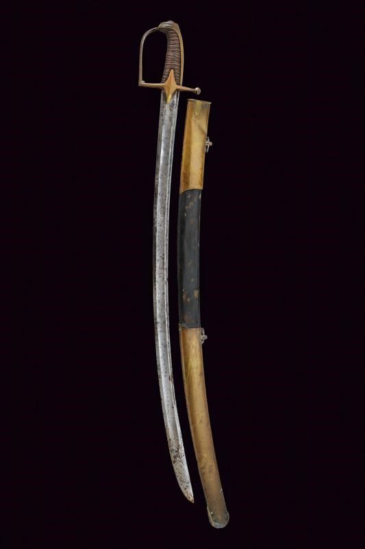 Francia, lunghezza 102 cm. Larga lama curva a un filo e controfilo con ampio sguscio centrale e scanalatura dorsale. Fornimento monoelso in ottone con alette fermafodero, il ramo dell'elso e del pomo scanalato e nervato, cappetta lunga e liscia. Impugnatura in legno rivestita di cuoio, con trecciola metallica. Fodero in legno rivestito di cuoio (di restauro moderno) con fornimenti in ottone e due anelli di sospensione.