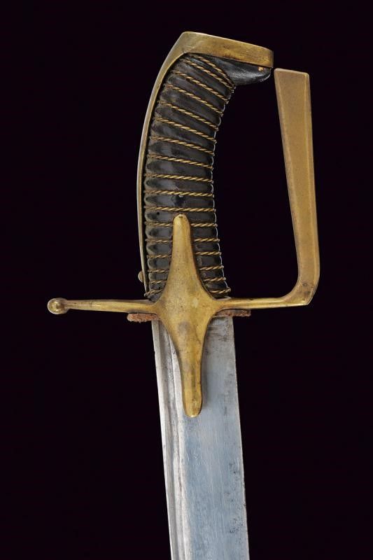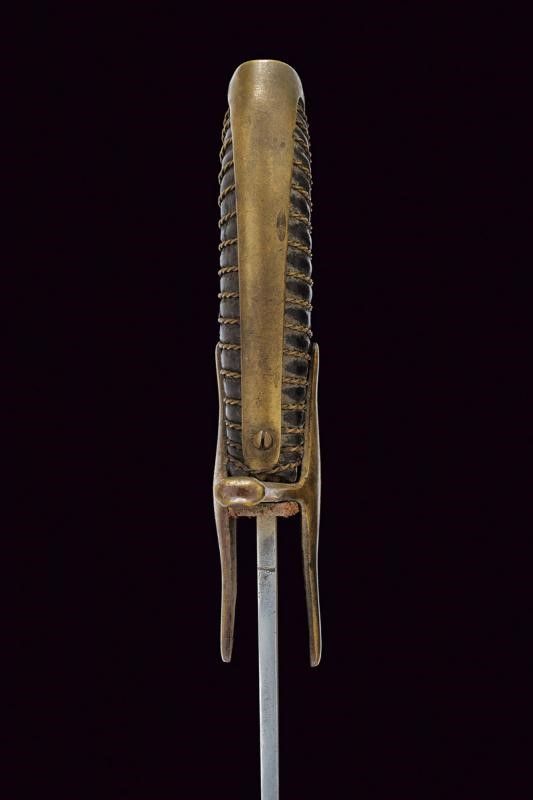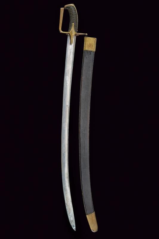 Europa orientale, lunghezza 98.5 cm. larga lama curva a un filo e controfilo con profonda scanalatura dorsale. Fornimento in ottone con alette fermafodero e ramo di guardia piatto. Cappetta lunga appuntita. Impugnatura in legno rivestita di cuoio, con spirale di trecciola metallica. Fodero in legno rivestito di cuoio con fornimenti in ottone. Piccoli danni. Rara. Polacca o ungherese.