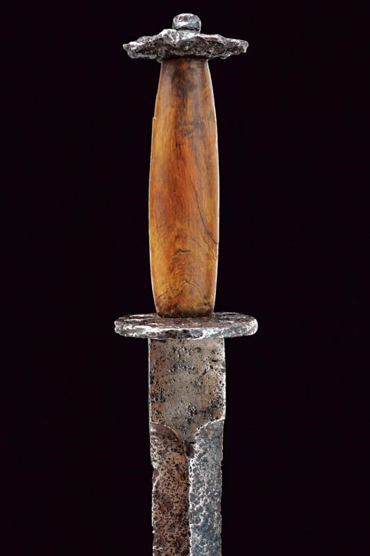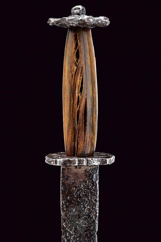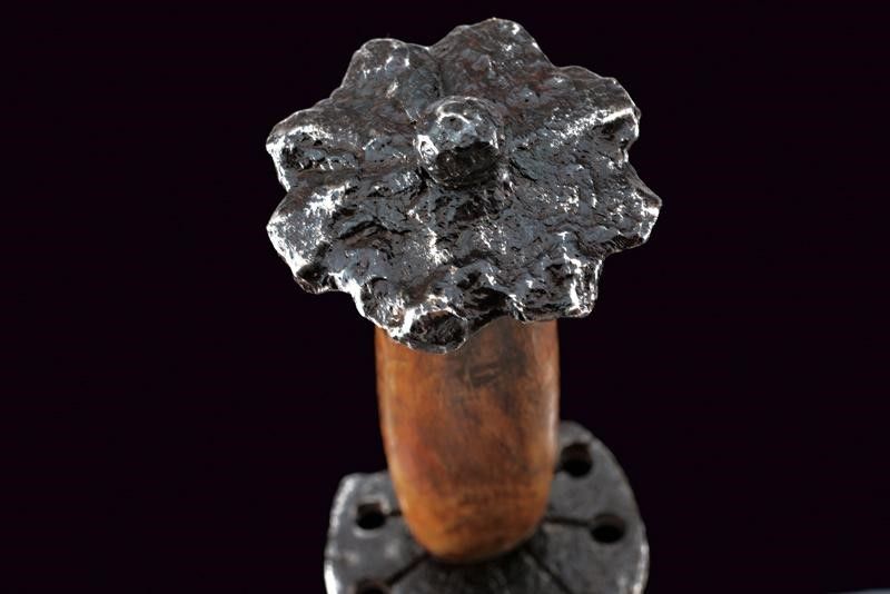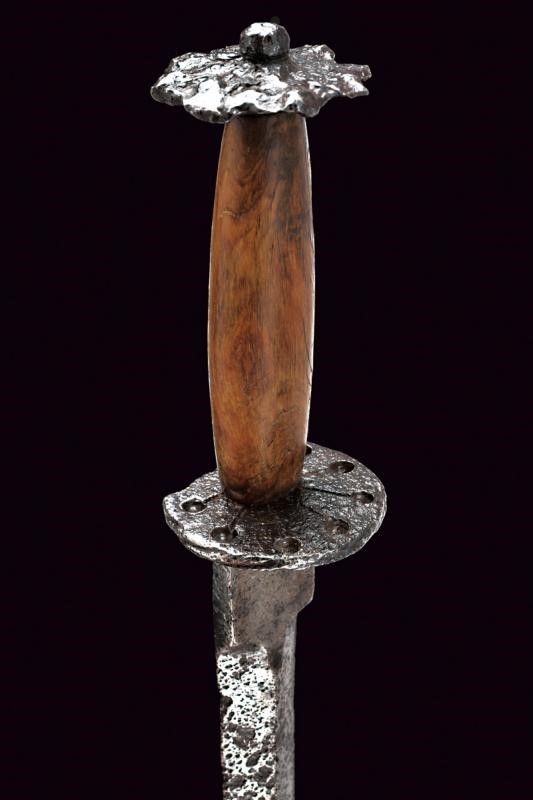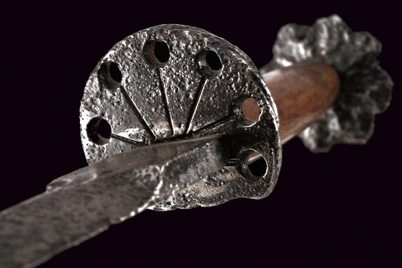 XV Sec. Lama dritta di sezione triangolare, ampie zone recanti danni da ruggine; tallone piatto e rettangolare. Impugnatura in legno con elso a disco traforato ed inciso a raggi. Bel pomo a stella. Raro.