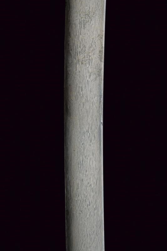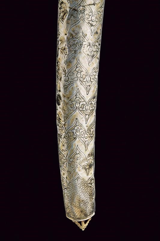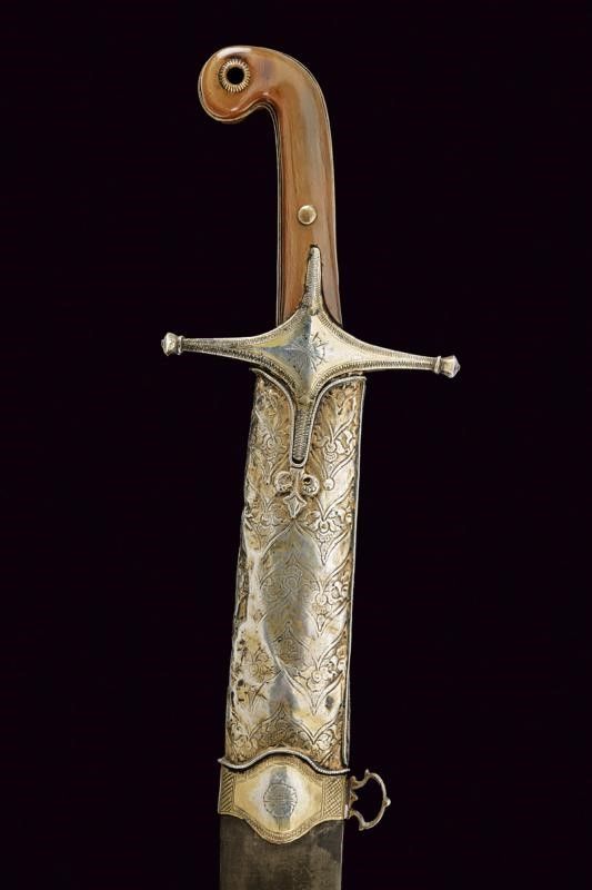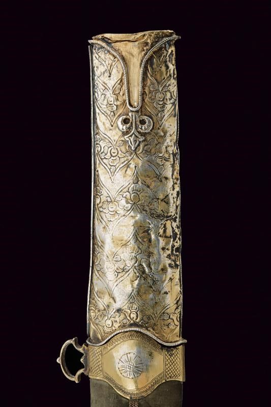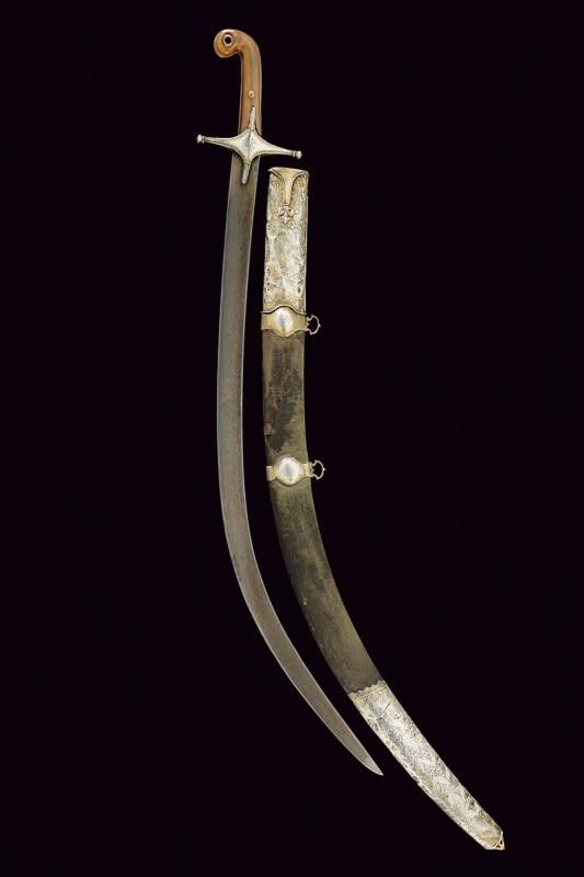 Impero Ottomano, lunghezza 90.8 cm. 1800 circa Lama piatta, curva, a un filo, in bel damasco ed in buone condizioni. Fornimento in vermeil con elso a croce inciso a motivi floreali e geometrici. Cornice dell'impugnatura con nervatura centrale. Guancette in corno con pomo angolato. Fodero in legno rivestito di velluto verde (completamente liso ed in patina scura). Fornimenti in argento finemente incisi a motivi floreali e con resti di doratura (intaccature e segni d'uso e del tempo). Due anelli di sospensione su fasce convesse e decorate en suite.