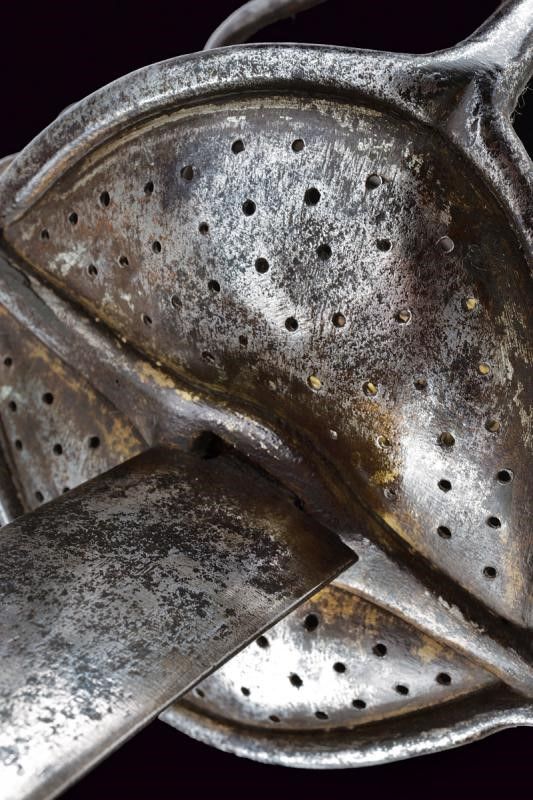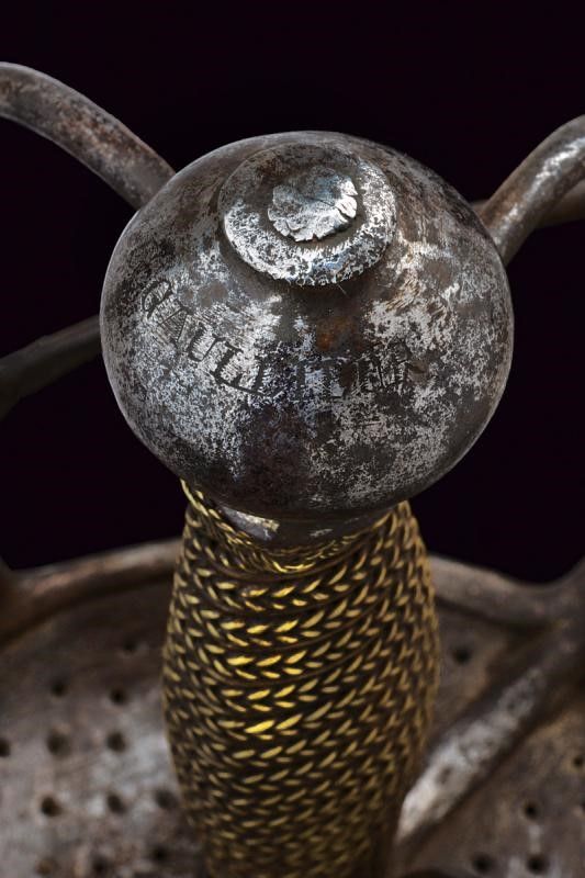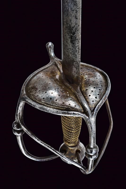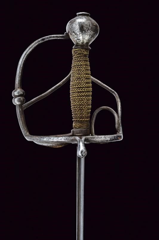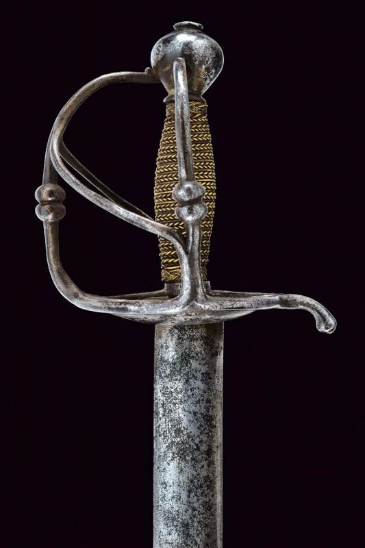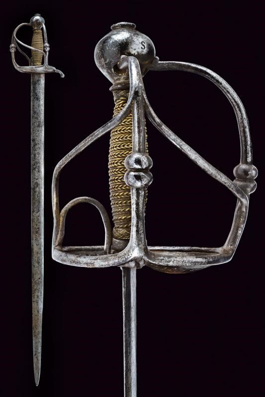 ultimo quarto del XVII Sec. Lama di media larghezza, dritta, a due fili, di sezione lenticolare. Fornimento in ferro a due valve traforate, quattro rami di guardia di cui due decorati decorati a doppio nodo, anello da pollice, pomo a vaso marcato 'S' e con firma 'G. QUALLIEUR'. Impugnatura in legno, rivesta con trecciola e dotata di teste di moro, in filo d'ottone.