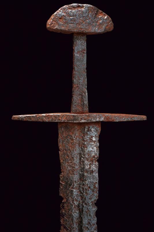 Europa, lunghezza 87,5 cm. XIII Sec. Lama dritta a due fili convergenti, con sguscio centrale che corre per buona parte della lunghezza. Elso in ferro a bracci dritti leggermente rastremati verso le estremità . Codolo di forma quasi rettangolare. Pomo sul tipo a noce di Brasile ma di sezione non particolarmente spessa.