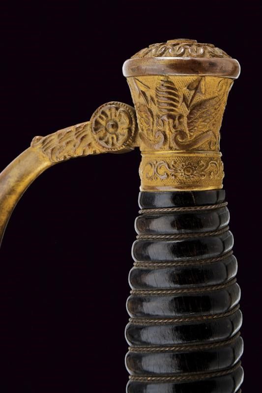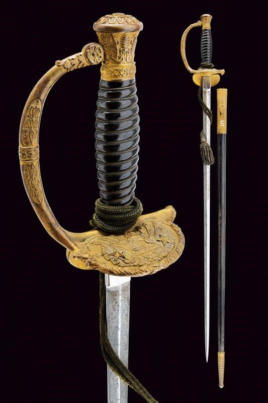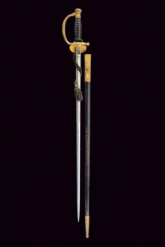 Belgio, lunghezza 99,5 cm. Lama dritta a sezione di losanga, incisa per metà lunghezza con bande floreali; il tallone liscio. Fornimento in metallo color bronzo con resti di doratura. La valva anteriore con il Leone del Belgio in rilievo su un trofeo di stendardi, con fronde di lauro e quercia in basso, e posto fra due stelle a cinque punte. La guardia con fronde di quercia in rilievo. Il Pomo con bacchette di Giove e decori floreali. Impugnatura in corno bruno, spirale di trecciola e filo di rame. La valva posteriore tornante e caricata con trofeo d'armi in rilievo. Fodero in cuoio con fornimenti in metallo recanti resti di doratura. Insieme con una dragona in peggiore stato di conservazione.