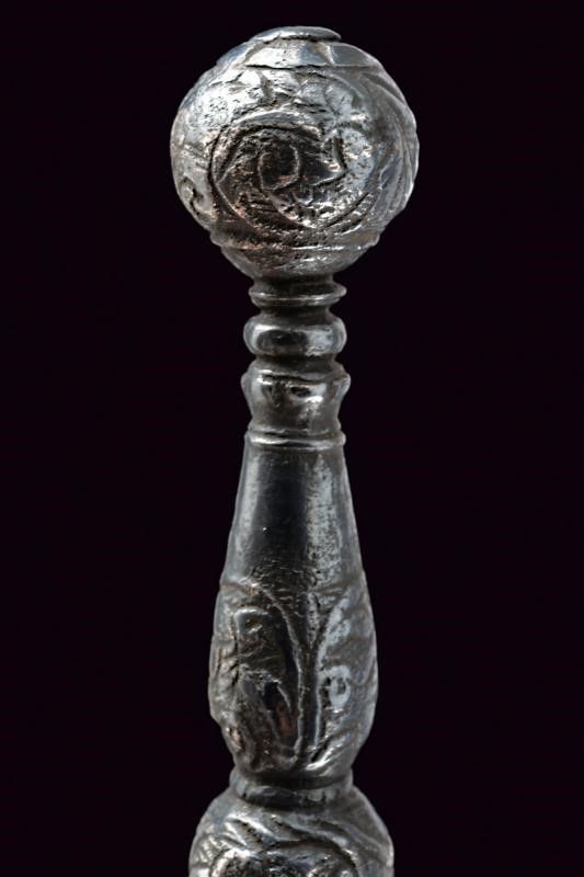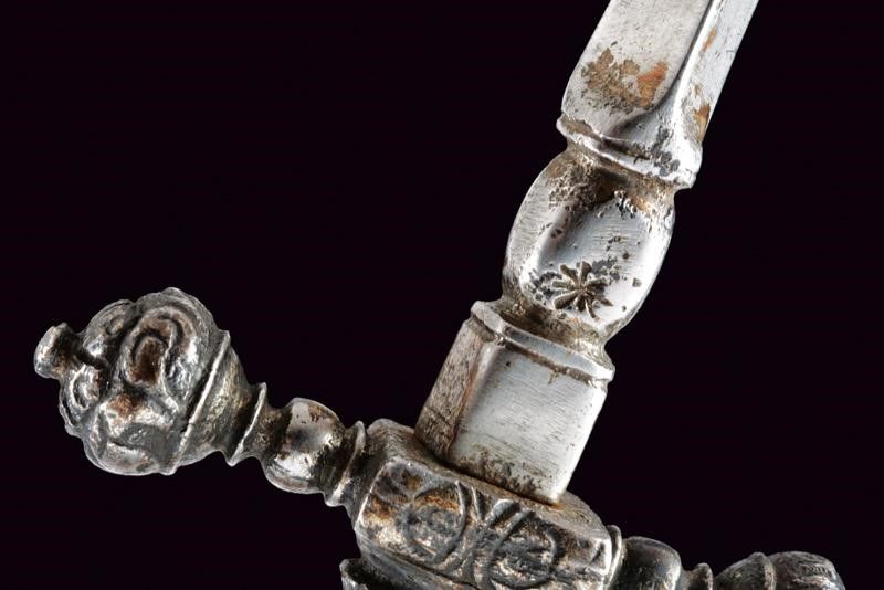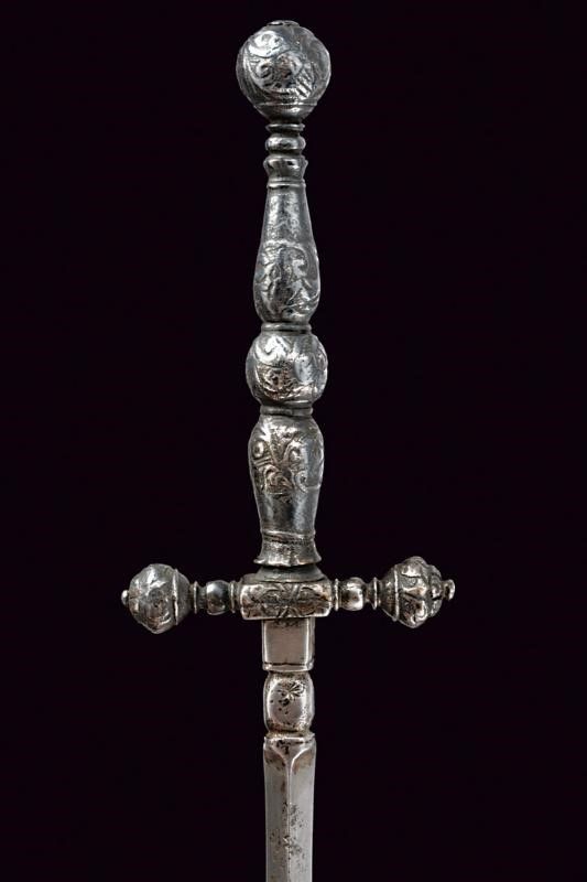 XVII Secolo Lama dritta di sezione triangolare con brevissimo tallone. Nodo con punzone. Fornimento in ferro massiccio interamente intagliato a motivi floreali, bracci dell'elso dritti con testa a bocciolo bottonato, impugnatura a doppio balaustro con grosso bottone sferico al centro.