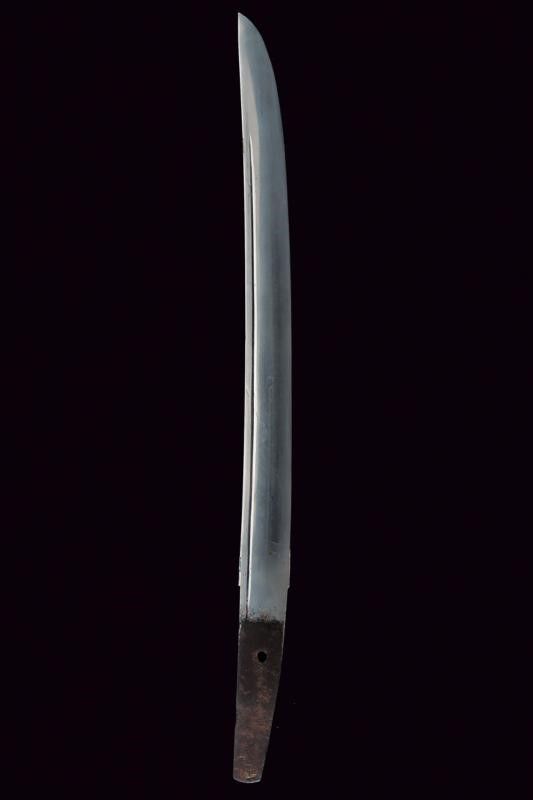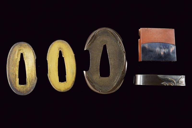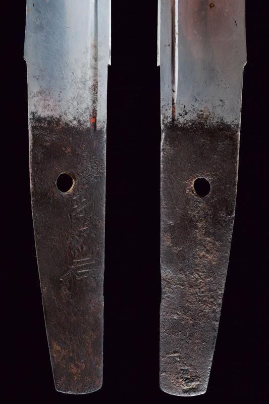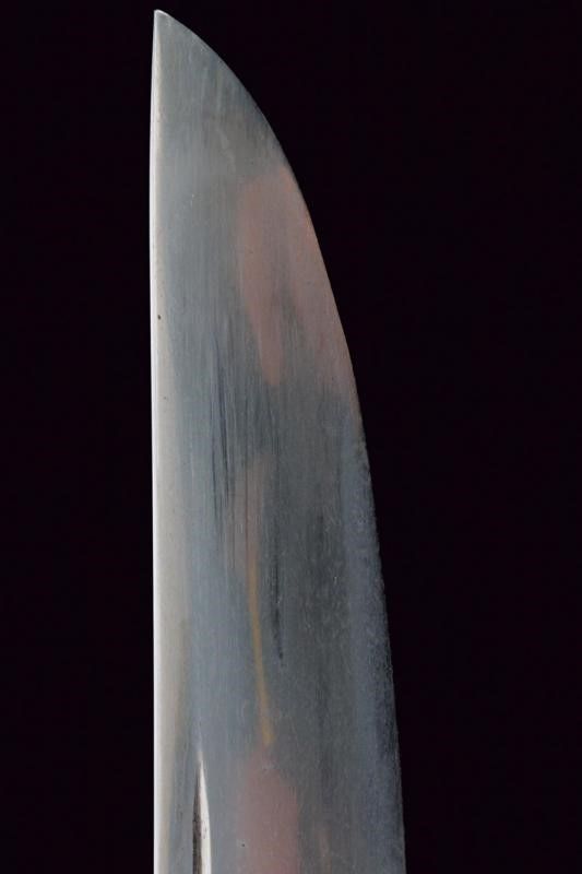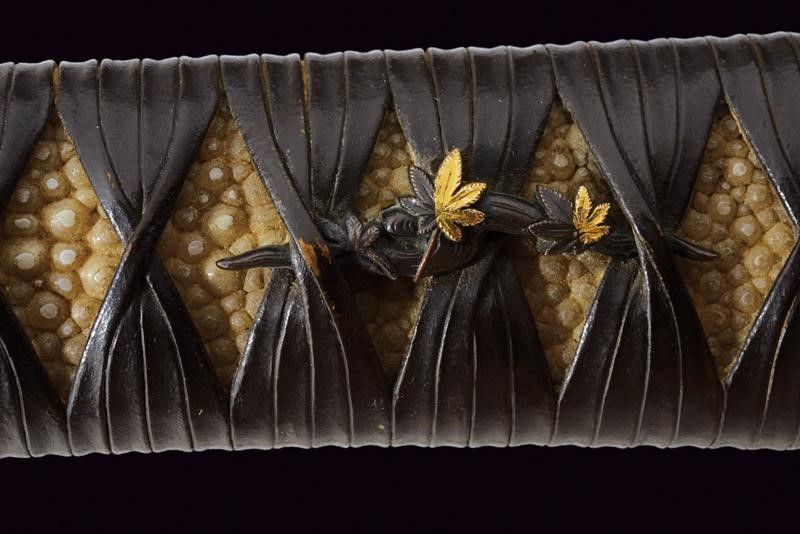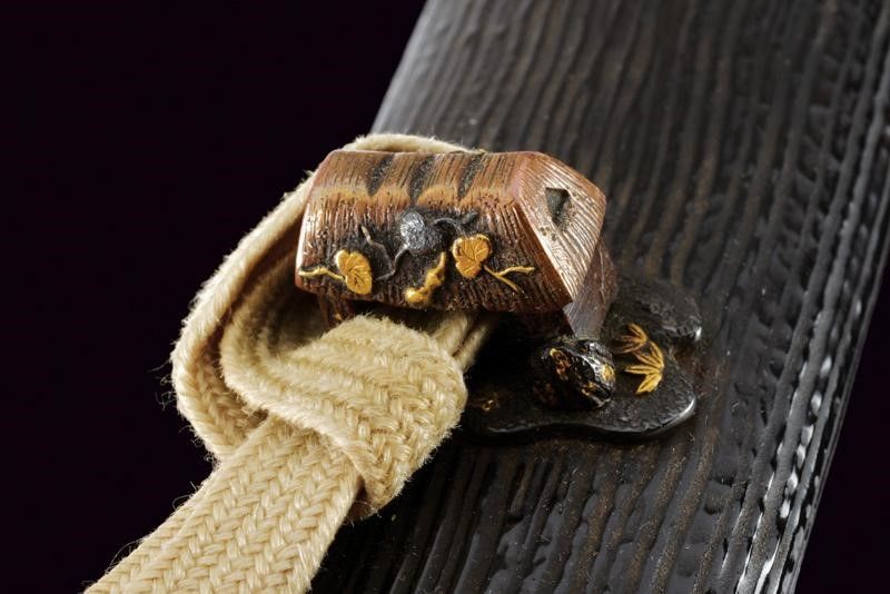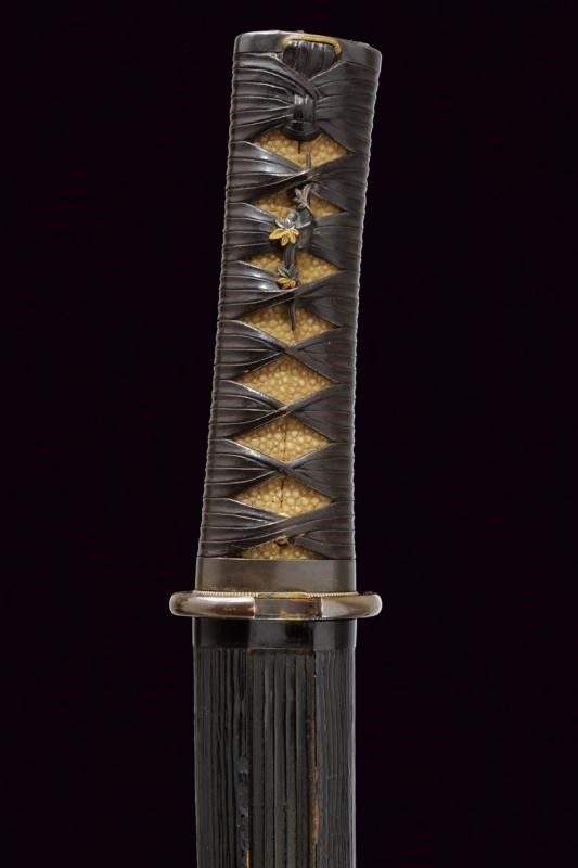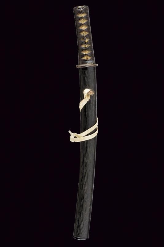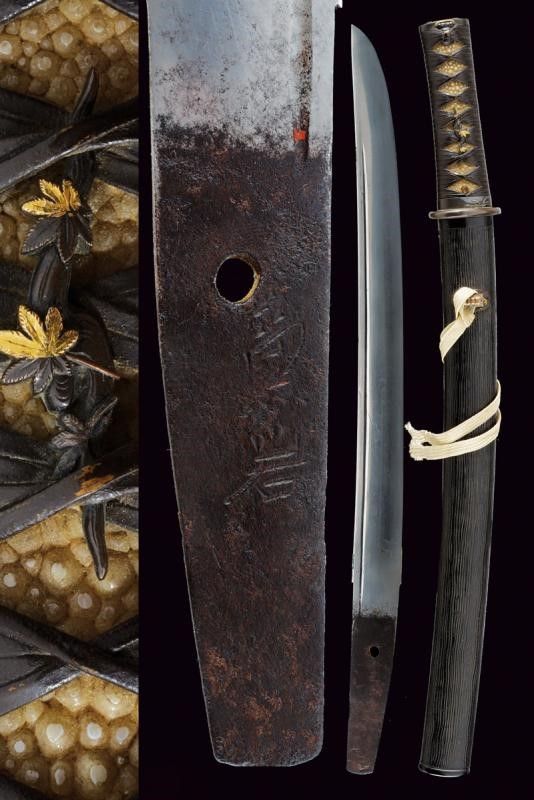 Periodo Muromachi (1392-1573) Nagasa 30.2 cm. Hamon: Hoso Suguha; hada: Itame Masame, doppio habaki in rame; Nakago mei 'Kanewara', Ubu Kurijiri; Yasuri Higaki. Bellissima koshirae con tsuba ovale in shakudo, fuchi decorato con erba sotto la luna, kashira con volatili, sempre in bassorilievo parzialmente in oro ed argento. Eleganti menuki in shakudo annerito e dorato decorati a motivi floreali. Tsuka in pelle. Saya in legno laccata e decorata a sottili scanalature simili alla struttura di legno, bellissimo Kurigata in rame a lavorato a effigiare un edificio, con decorazioni floreali parzialmente dorate. Tardo Periodo Muromachi - inizio Tensho (circa 1573), scuola Minoseki, gruppo Shizo Saburo. Kanewara lavorava come Wakasa No Jo Ujifusa.