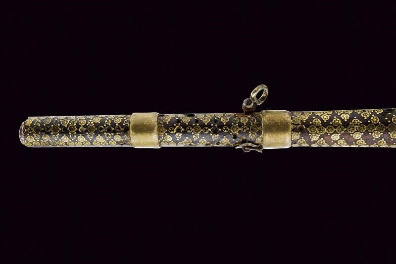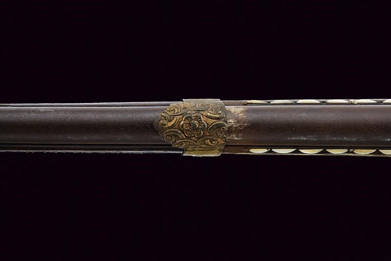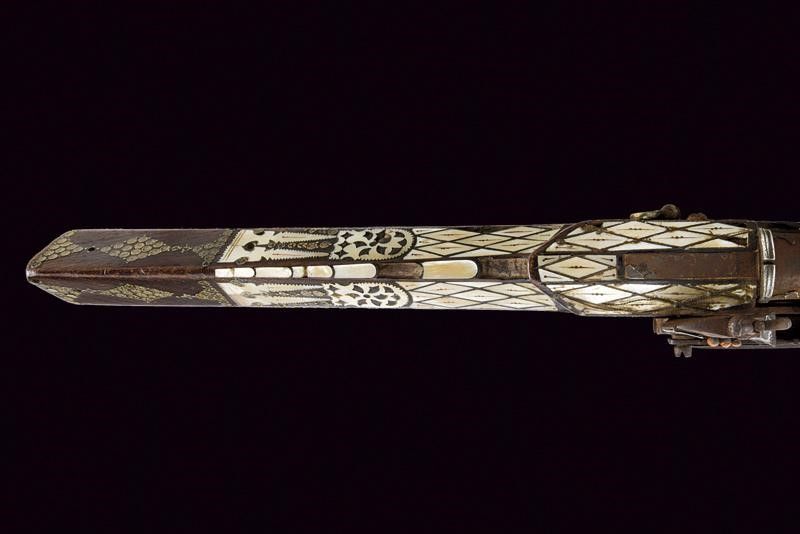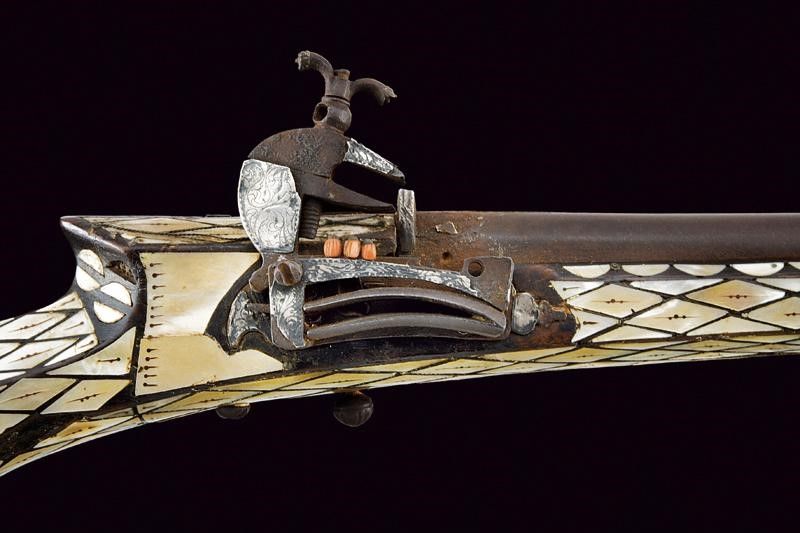 Bulgaria, lunghezza 95,5 cm. XIX Secolo Canna tonda liscia (accorciata), con culatta munita di alzo ben rilevato e argentato. In volata cal. 14 mm. Codolo con tracce di lamina in argento (quasi completamente mancante). Batteria alla micheletta con cane di tipica forma a dorso tondeggiante; anche questa recante resti di lamine in argento, incise a motivi floreali. Grilletto sferoide in ferro. Meccanica da rivedere. Cassa in legno (accorciata) con calcio a sezione pentagonale e sottile. Il segmento centrale riccamente ornato con tarsie in madreperla a rombi (in buona parte presenti) e parzialmente incise. Il collo sempre con tarsie in madreperla a rombi che poi assumono forme più elaborate e sono anche traforate. Il resto della cassa ornato per buona parte con il tipico decoro ad agemine in ottone a dischetti smaltati, anche questi conservati in buona parte. Il lato sinistro dotato di due passanti snodati. Bacchetta mancante.