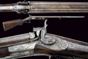 Italia, lunghezza 126.5 cm. Canne lisce tonde in damasco, munite di bindella e mirino, cal 17 mm. Codetta incisa, [..]