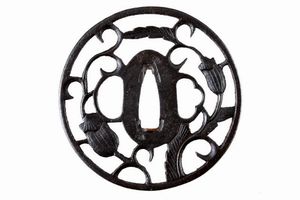 Giappone, dimensioni 6.8 x 7.1 x 0.5 cm. Periodo Edo (1603-1867) In ferro cade-maru-gata, sukashi-bori con disegno [..]