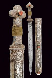 Tibet, lunghezza 58 cm. Fine del XIX Secolo Robusta lama dritta a un filo. Fornimento rivestito con lamina d'argento, [..]