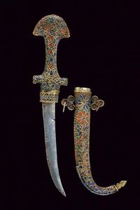 Marocco, lunghezza 37 cm. 1900 circa Tipica lama semplice a un filo e controfilo. Impugnatura e fodero in metallo [..]