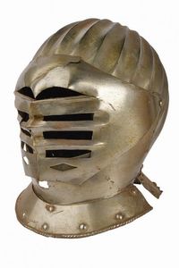 Germania, altezza 30 cm. 1620 circa Coppo lavorato in un unico pezzo a raggi, visiera alla massimiliana con fessure [..]