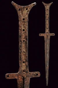 Brescia, lunghezza 42 cm. XVIII Secolo Robusta lama dritta a due fili di sezione a losanga con facce incavate, [..]