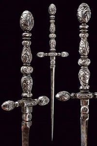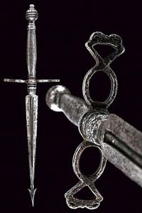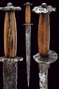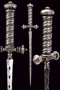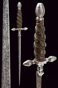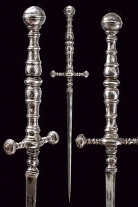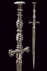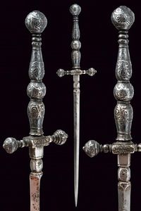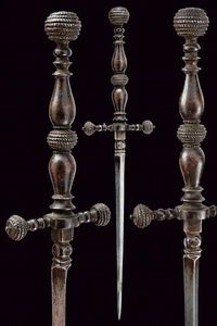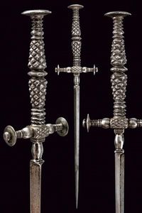 Italia, lunghezza 32 cm. XVII Secolo Lunga lama dritta di sezione triangolare con brevissimo tallone. Nodo a colonna [..]