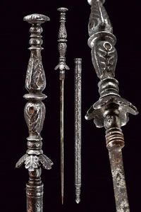 Italia, lunghezza 32 cm. XVII Secolo Lama dritta di sezione triangolare. Nodo sferoide schiacciato. Il massello [..]