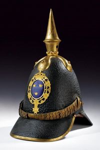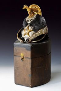 Prussia, altezza 15 cm. 1900 circa Corpo rivestito in pelliccia di opossum, l'imperiale mancante. Fregio frontale [..]