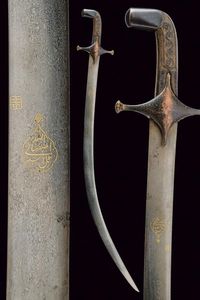Impero Ottomano, lunghezza 90.8 cm. 1800 circa Lama piatta, curva, a un filo, in bel damasco ed in buone condizioni. [..]
