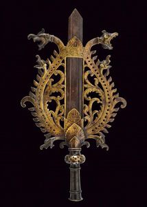 Indopersia, altezza 50.7 cm. Prima metà del XVIII Secolo Al centro larga lama dritta a due fili con punta triangolare [..]