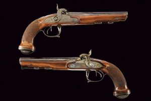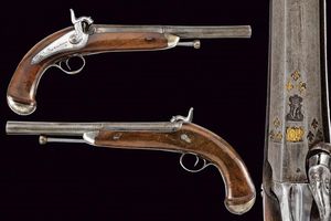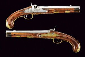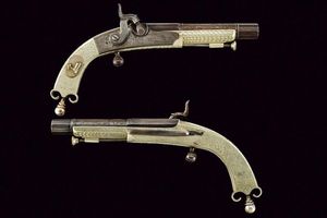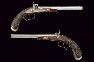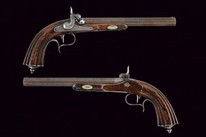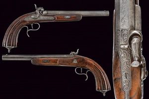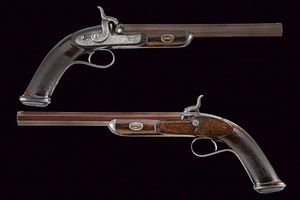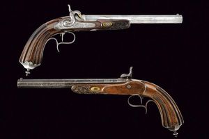 Milano, lunghezza 35.5 cm. Canne lisce ottagonali, munite di mirino di precisone, cal. 16 mm. Codette con alzo. [..]