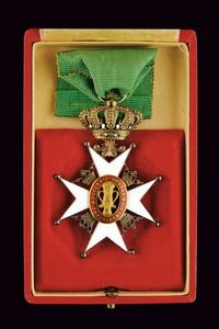 Stato Pontificio, dimensioni 3.4 x 6 cm. 1860-70 Croce da cavaliere militare, in oro e smalti; completo di nastro [..]