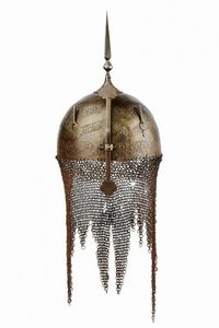 Indopersia, altezza 19 cm. XVI/XVII secolo Completamente in ferro, con coppo emisferico sormontato da una bassa [..]