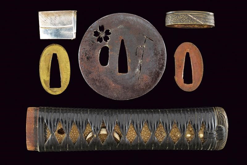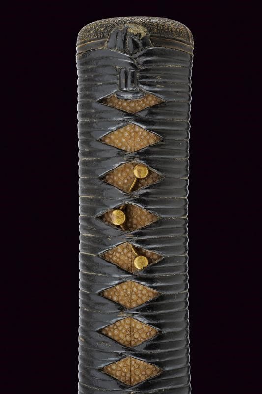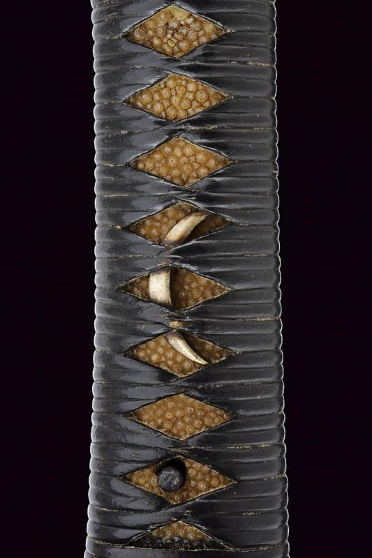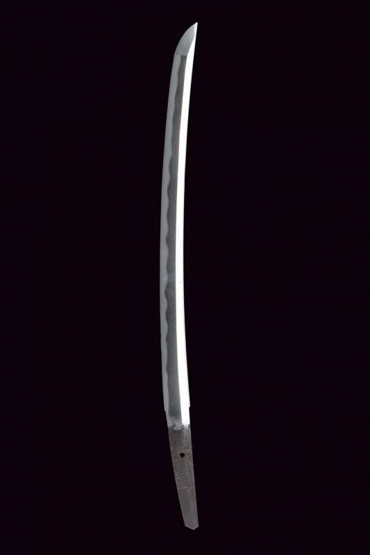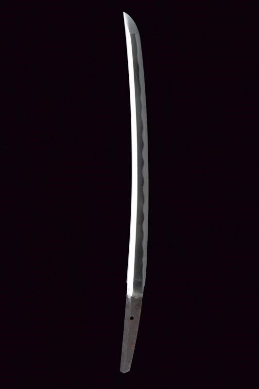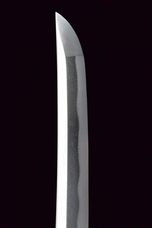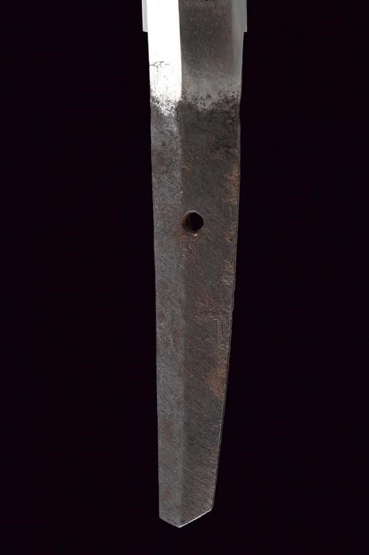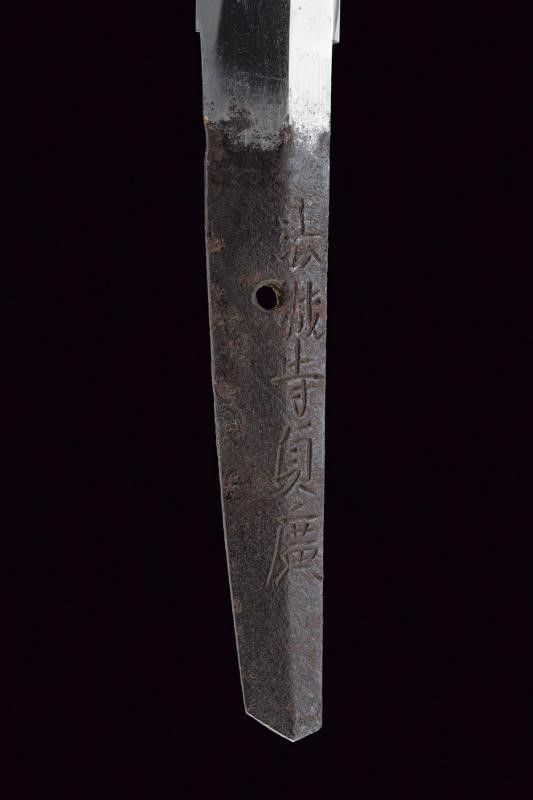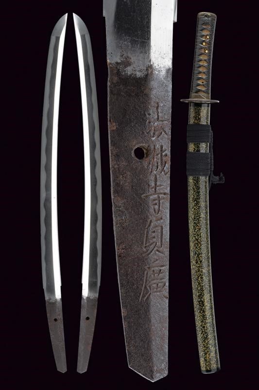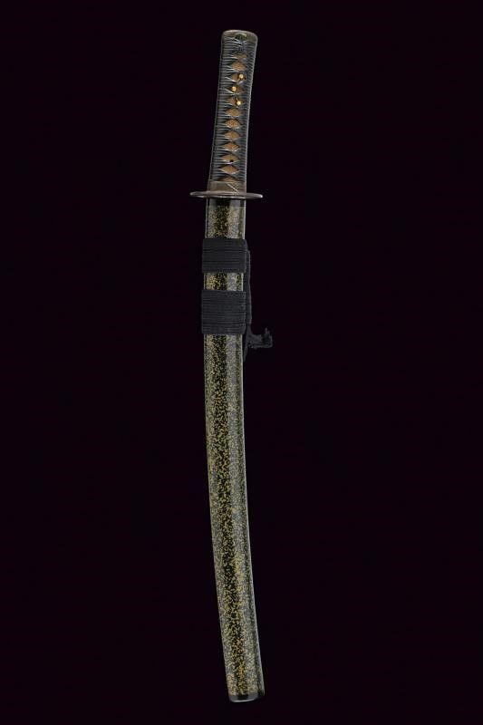 Giappone, lunghezza 57,5 cm. Periodo Edo (1603-1867) Lama Shinogi-zukuri, Iori-mune. Nagasa: 39,2 cm. Hamon e Hada visibili. Nakago mei: Hojoji Sadahiro. In koshirae con habaki laminato in argento. Tsuba maru-gata in ferro decorata a traforo con fiore di ciliegio. Fuchi e Kashira lavorati en suite con canne di bambù argentate su fondo a granuli. Tsuka-ito in pelle (laccata), Same in pelle di razza. Menuki effigianti rispettivamente la falce lunare in argento e tre punti collegati da linee (una costellazione?). Saya di produzione più recente con rivestimento in lacca nera screziata verde-oro. Lama epoca Shinto. Koshirae Tardo Edo.