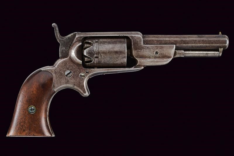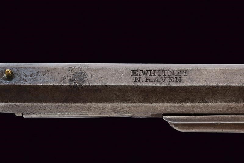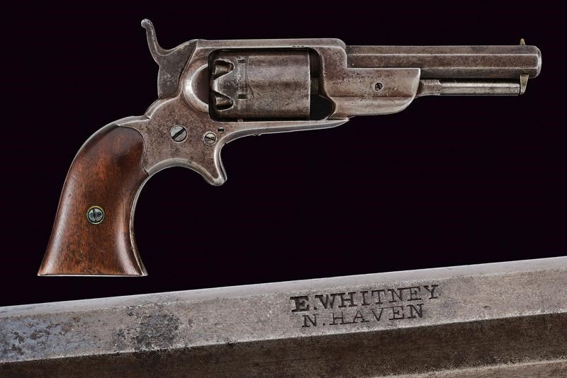 USA, lunghezza 19 cm. 1860 - 1867 Canna ottagonale da 3-1/2', rigata (rigatura visibile, anima da pulire), dotata di mirino conico in ottone, con marcatura 'E. WHITNEY / N. HAVEN', cal. 28. Tamburo a sei colpi con resti di incisioni. Meccanica funzionante ma problemi alla rotazione del tamburo. Castello in ferro con grilletto a sprone. Canna e castello con matr. '14xx'. guancette in noce. Non comune.