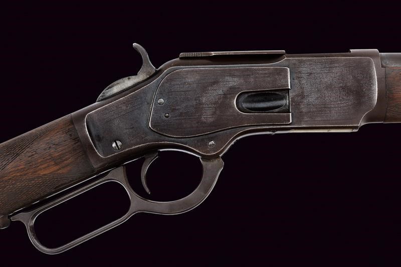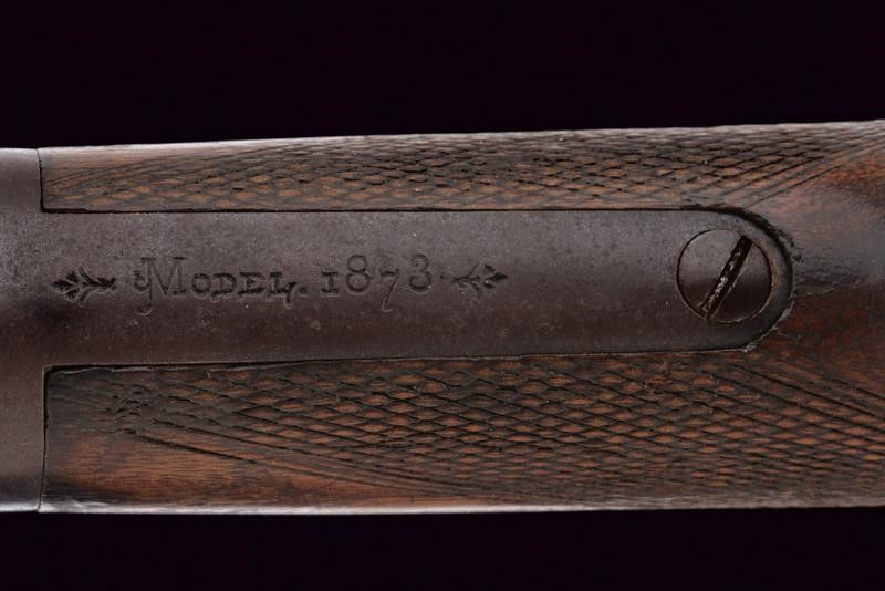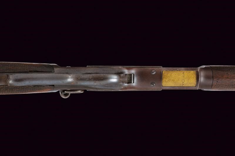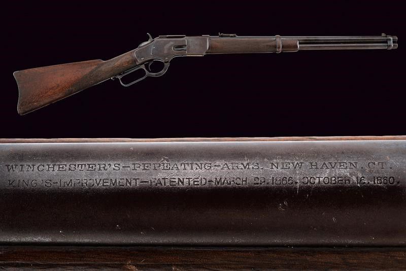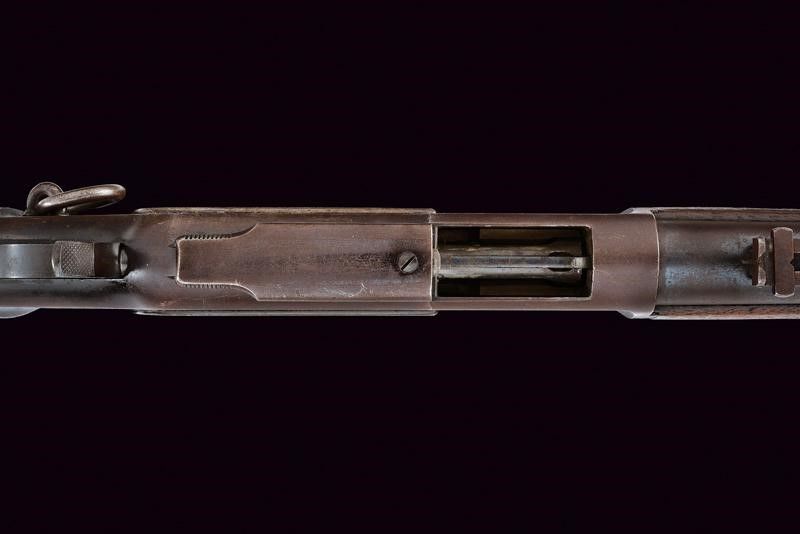 USA, lunghezza 98,3 cm. 1883 Canna tonda rigata da 20' (l'interno con lievi zone di pitting e rigatura visibile), recante marcatura della ditta in due righe con 'KING'S IMPROVEMENT' e brevetti sino al 1860, dotata di alzo abbattibile e regolabile completo di cursore e datato '1873'. Sopra alla culatta marcatura '44 CAL'. Castello in ferro con guida del coperchio dell'estrattore in un unico pezzo con il telaio. Carrello elevatore in ottone con marcatura '44 CAL.' sul fondo. Meccanica funzionante. Anello da sella sul fianco sinistro. Calcio ed astina in legno (segni d'uso e del tempo) entrambi con resti di zigrinatura. Fornimenti in ferro. Calciolo del tipo con sportellino (senza bacchetta all'interno). I codoli del castello con dicitura del modello e matr. '156xxxA'. Canna e castello con lievi tracce di brunitura, probabilmente antica.