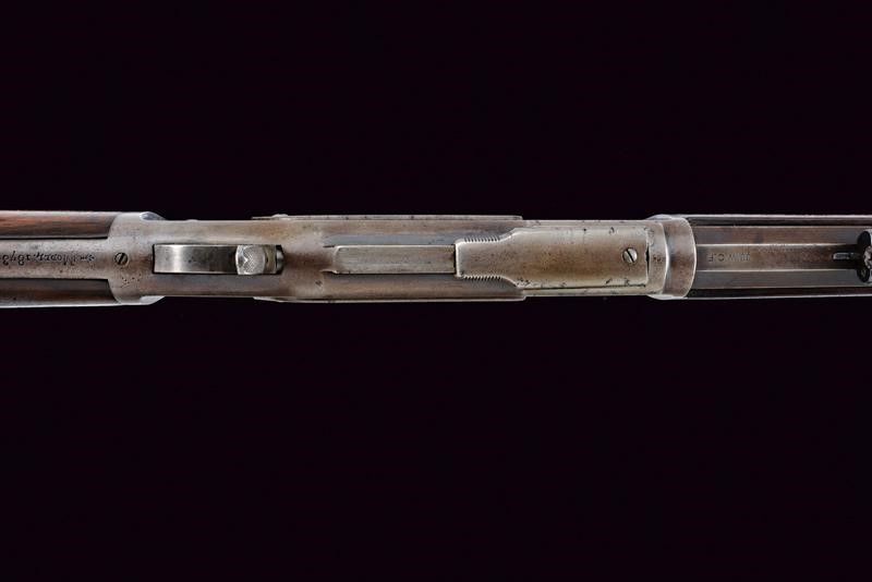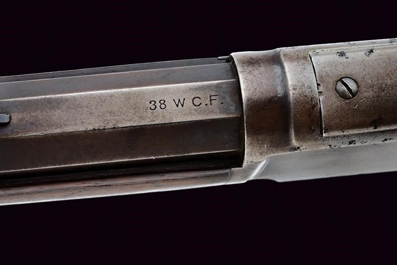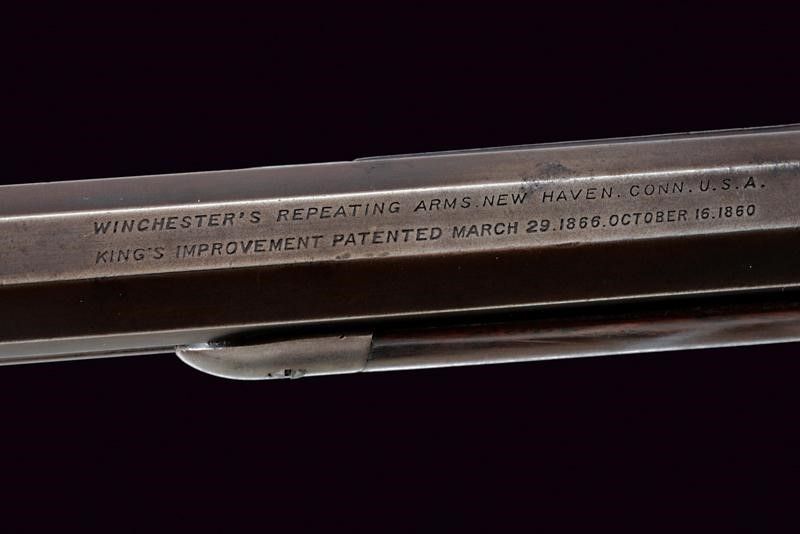 Terzo quarto del XIX Secolo Canna rigata tonda, dotata di mirino ed alzo regolabile, marcata con indirizzo della ditta, con 'KING'S IMPROVEMENT' e brevetti fino al 1860, marcatura del calibro '38 W.C.F.' Anima con un po' di pitting e rigatura visibile. Castello con codolo superiore recante dicitura del modello, quello inferiore con matr. '548xxx B'. Carrello elevatore in ottone, marcato '38 CAL.' Meccanica funzionante. Calcio ed astina in noce, entrambi lisci. Fornimenti in ferro. Calciolo liscio del tipo con sportellino. Tracce di brunitura antica.