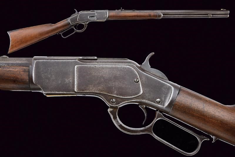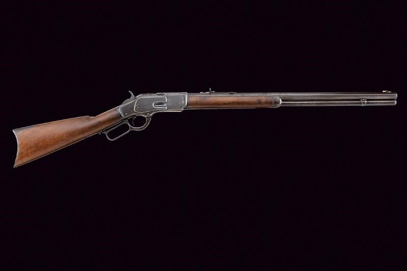 1875-1890 Canna rigata ottagonale, dotata di mirino ed alzo regolabile, marcata con indirizzo della ditta, con 'KING'S IMPROVEMENT' e brevetti fino al 1860, marcatura del calibro '44 W.C.F.' Anima con pitting e rigatura ben visibile. Castello con codolo superiore recante dicitura del modello, quello inferiore con matr. '366xxx B'. Carrello elevatore in ottone. Meccanica funzionante, sportellino dell'estrattore da rivedere in quanto presenta dei problemi di scorrimento. Calcio ed astina in noce, entrambi lisci. Fornimenti in ferro. Calciolo liscio, con sportellino in ottone, bacchetta presente. Terzo modello.