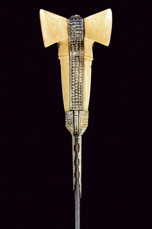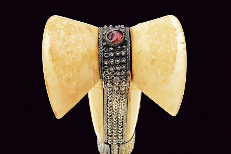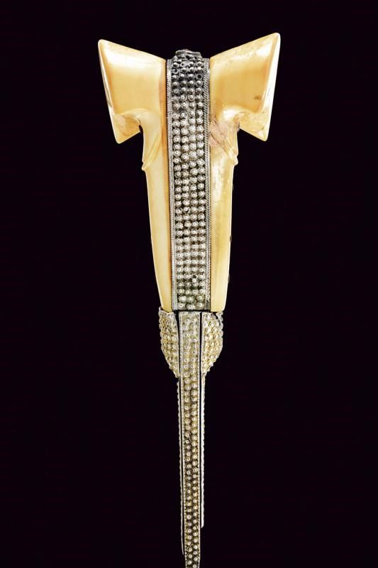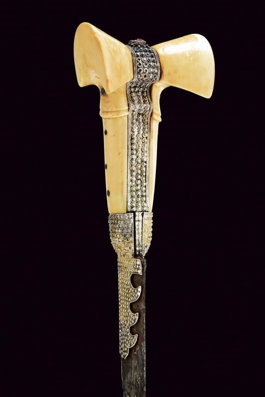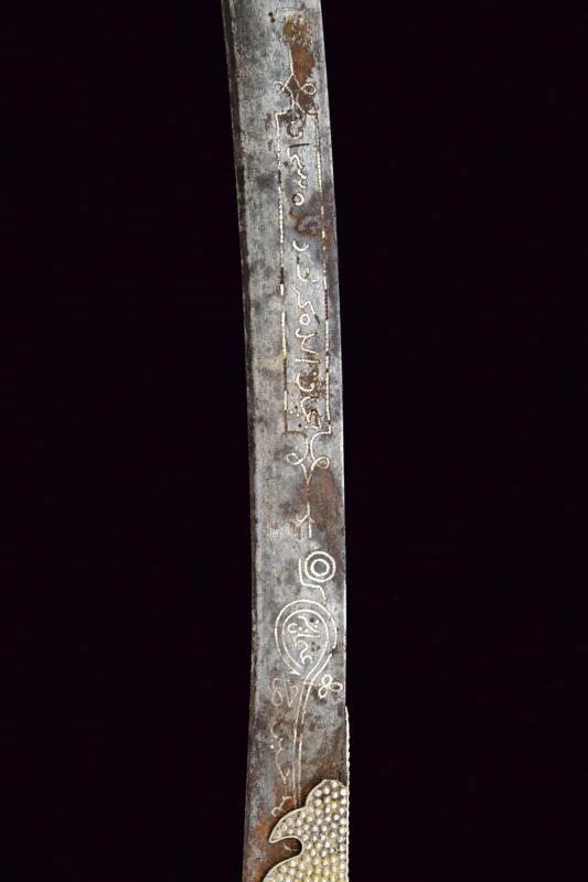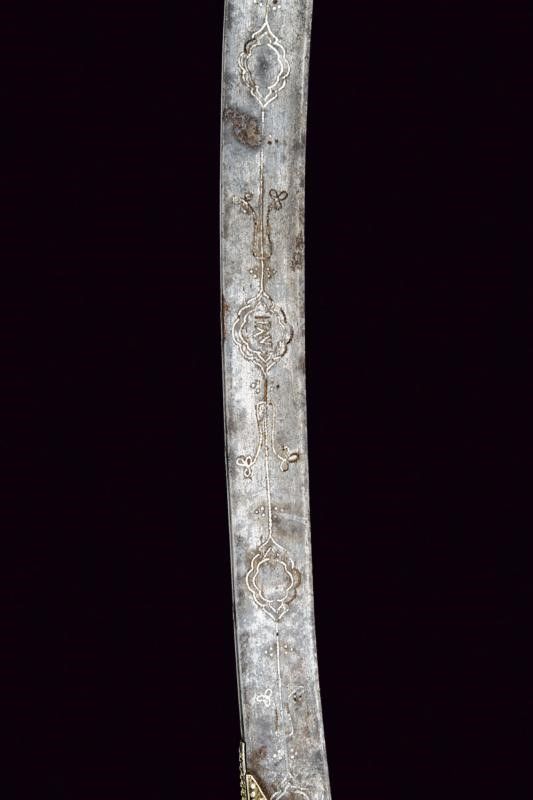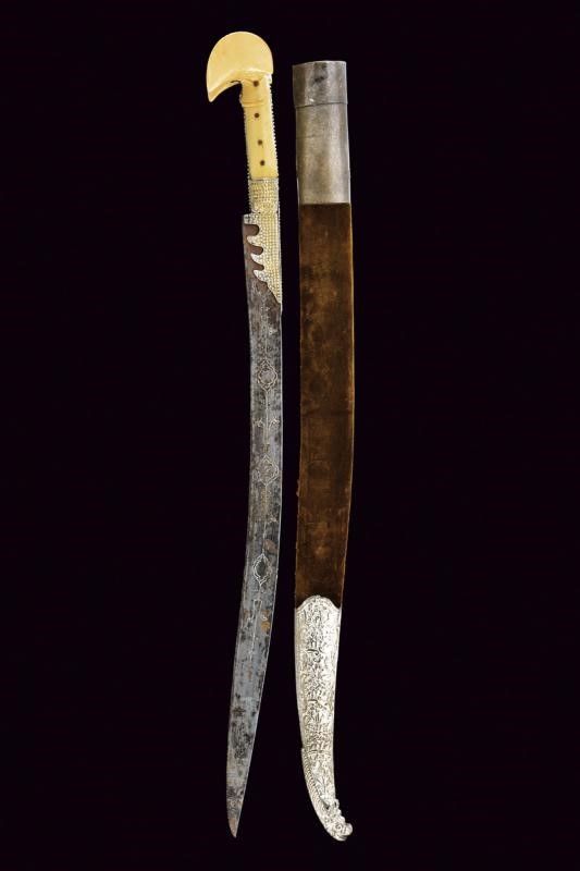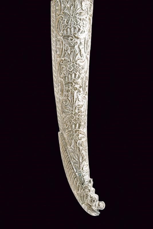 Turchia, lunghezza 68.5 cm. XIX Secolo Lama curva piatta, a un filo, con iscrizioni in caratteri arabi e decori a motivi floreali rimessi in argento; zone con danni da ruggine. Fornimento in argento decorato a rosette (piccola mancanza). Guancette in dente di tricheco (piccolo restauro). Fodero in legno rivestito con velluto marrone; cappa il lamina d'argento liscio con anello di sospensione, il puntale in argento decorato a motivi floreali in bassorilievo con estremità a testa di mostro.